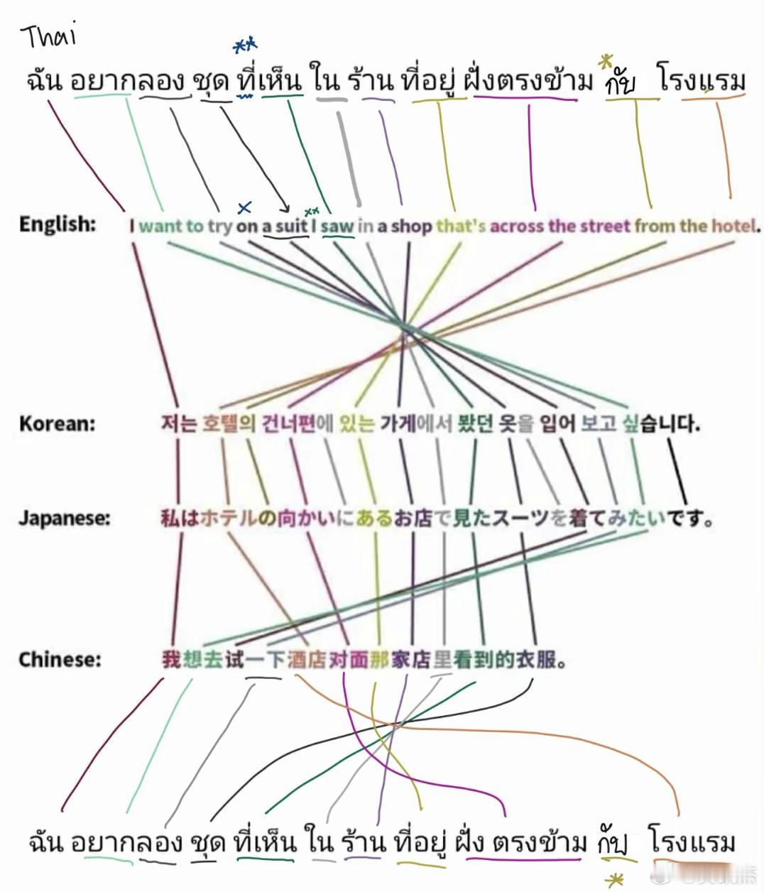 网友制作的中文,英语,日语,韩语,泰语语序对照图