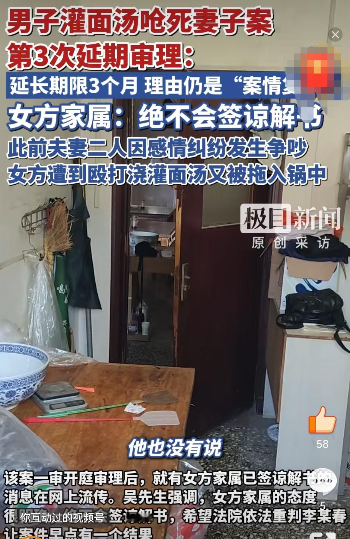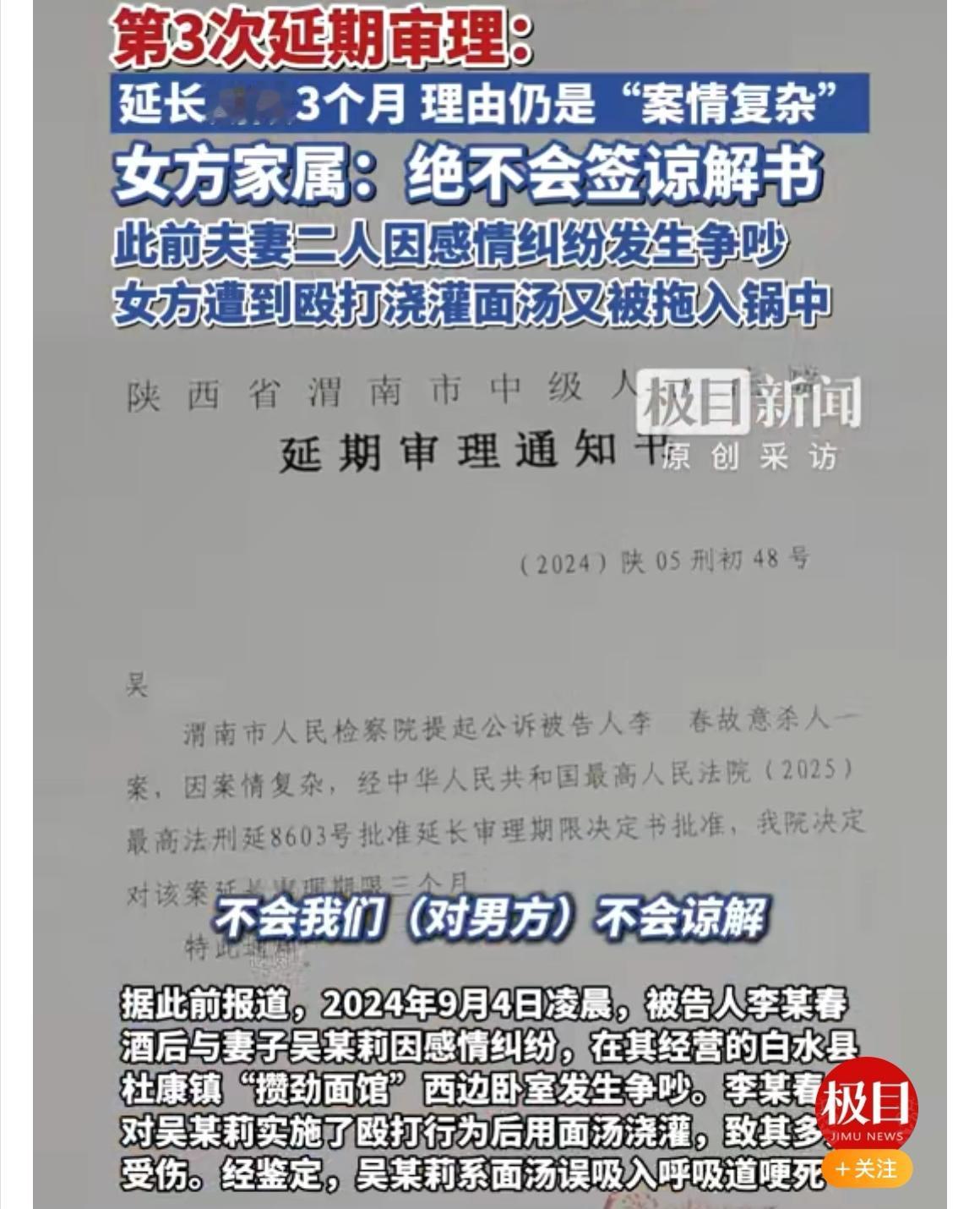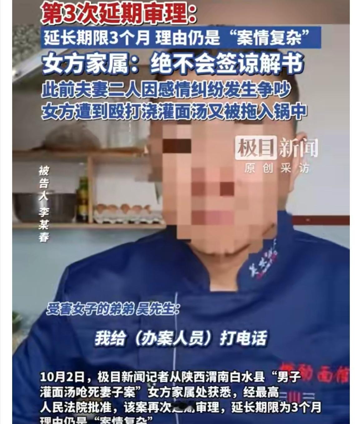 “面汤呛死妻子案”三度延期,案情扑朔 迷离引发舆论热议 还在等判决?发生在2024年9月的“男子灌面汤呛死妻子案”已经第三次延期审理了,理由还是大家都太熟悉的那一句——“案情复杂”。这消息一出,网友们也跟着皱起了眉,女方家属更是一头雾水,跑去法院和办案人员那边追问到底复杂在哪儿,结果对方只说复杂,具体细节却一个字都不透露。 案件的来龙去脉其实很明了:男方李某春因酒后与妻子吴某莉吵架,把面汤泼在妻子身上,最终导致妻子被呛死。案件发生后,李某春主动到公安机关投案自首,一审时全盘认罪认罚,还表示自己酒后断片,对过程并无记忆,并明确否认存在家暴行为。但是女方家属坚决不为其签署谅解书,态度鲜明——就希望法院能够依法从重判罚。 案件迟迟不决,也让不少人开始猜测其中是否有更多细节待揭晓,比如责任界定、行为性质、是否有过失致死或故意 行为等法律问题。从法律角度看,这类案子判决可能涉及鉴定报告、证人证言、夫妻矛盾调查等多个层面,不排除法院会根据案情进一步细化责任划分。不过,三番五次延期确实不常见,也给当事人和家属带来了不小的心理压力,能不能早日给个说法,大家都在等待中! 你如何看待这宗延审的案件?最终判决会偏向哪一方?欢迎留言区一起探讨。