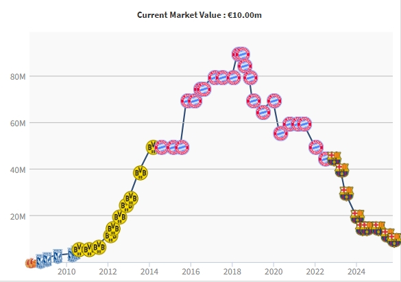 莱万的身价曾在2018年效力拜仁期间达到巅峰的9000万欧。