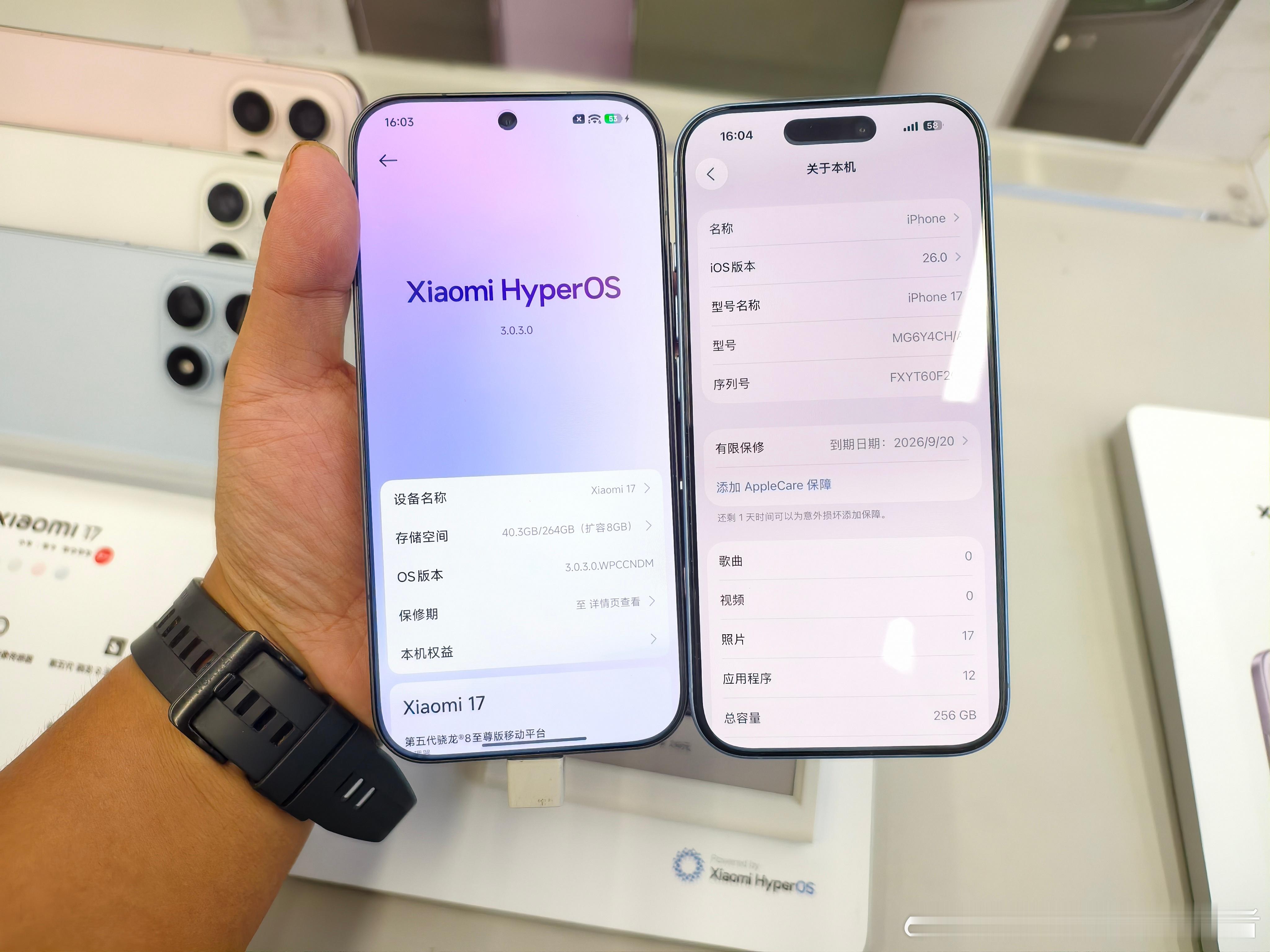 小米17也是6.3英寸屏幕,但整理尺寸比iPhone17要大一些。它的优势就是有徕卡影像、有长焦镜头、有更大的7000毫安电池和更快的充电速度。还有更强的IP69满级防水和超声波指纹,外围基本没短板。