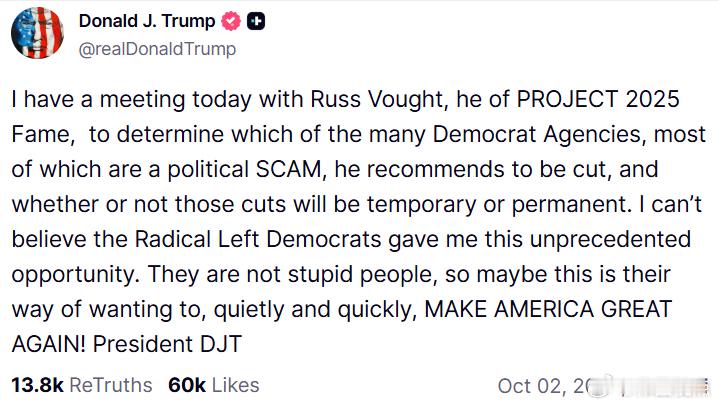 “我今天将与拉斯·沃特会面,他是“2025项目”的知名人物。讨论他建议削减哪些民左党控制的机构——这些机构大多数都是政冶骗局——以及这些削减是暂时的还是永久的。我简直不敢相信激进左派民左党给了我这个前所未有的机会。他们不是愚蠢的人,所以也许这是他们想悄悄地、快速地让美国再次伟大的方式!”