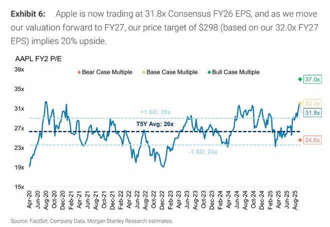 自iPhone17发布会前一天以来,苹果股价已上涨7%至255美元。大摩认为,这一涨幅很大程度上已经消化了市场对iPhone17周期的乐观情绪。从战术层面看,市场价格已经反映了他们最新的FY26基本情景预测。