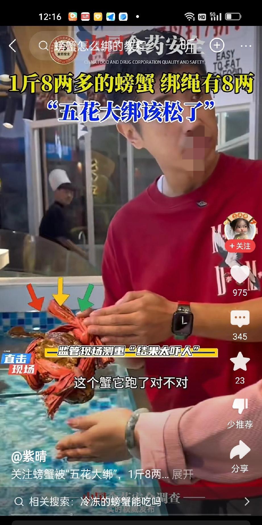 红衣男子去海鲜市场买螃蟹,店家拿出两只五花大绑的螃蟹给他,一称重量高达1斤8两4。男子看着螃蟹个头也不大啊,怎么这么重了。他仔细看了一下之后,发现那个绳子又粗又多。男子要求店主把绳子拆掉再称。店家却不愿意,说卖螃蟹没有去绳称重的。男子大发雷霆,怒斥,我是买螃蟹,又不是买绳子,你这绳子都快8两4了吧?店家理直气壮,对的,我这1斤8两4的螃蟹就是8两4的绳重,你爱买不买,不买拉倒。红衣男子扔下螃蟹就走,暗暗发誓,永远不买捆绳卖的螃蟹。
