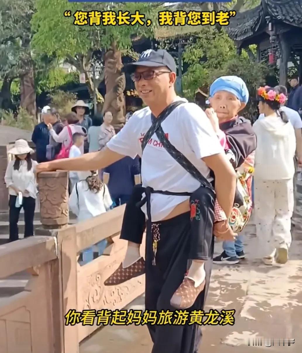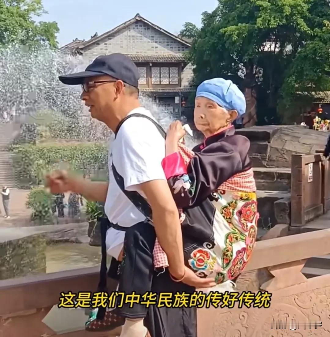 5月1日,于四川景区内,有一位大叔背着年届九旬的老母亲游览黄龙溪风景区。由于大叔自己也不再年轻,所以只能借助背带将母亲固定在自己的后背上。母亲就宛如孩童一般,这正应了那句“您背我长大,我背您到老”。 这便是中华民族的优良传统。