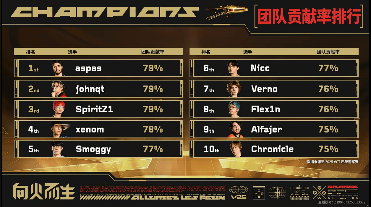 虎扑10月03日讯1.今天官方直播流中给出了冠军赛截至目前团队贡献率的排行榜单,其中aspas位列第一,CN赛区共有四人上榜,分别是SpiritZ1、Smoggy、Nicc、Flex1n。