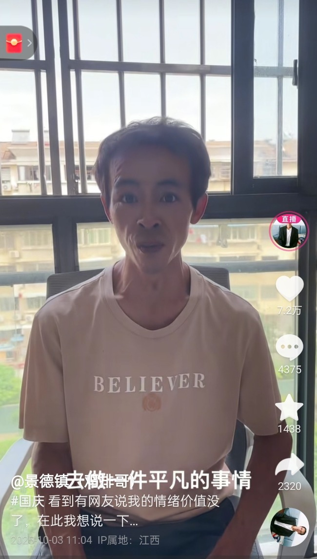 看到有网民说“鸡排哥”的情绪价值没了,对此“鸡排哥”进行了解释。10月3日,“鸡排哥”在其社交媒体平台上表示,自己作为一名普通的劳动者,始终在平凡岗位上做平凡的事。他本人并非刻意追逐流量,而是希望让更多人了解景德镇的发展面貌,以及当地人的善良好客。