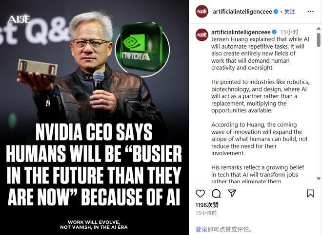 然而英伟达CEO黄仁勋有不同的看法,他认为人类未来将会更加“忙碌”。AI即将创造新的工作领域,这些领域将需要人类的干预、创造力和监督。