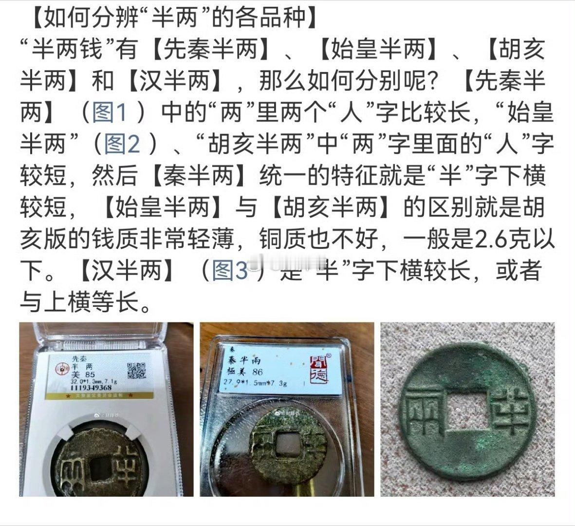 为什么很多古币商贩会用【汉半两】冒充【秦半两配到“大五帝钱”中?因为极美品相的【汉半两】大概二三十块钱,而极美品、字迹清晰完好、重量在3.5克以上的【秦始皇半两】三四百元,10倍以上的价差,让很多古币商贩