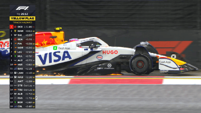 虎扑10月03日讯F1新加坡站第二节自由练习赛,小红牛车手利亚姆-劳森在17号弯撞车,再度触发全场红旗。
