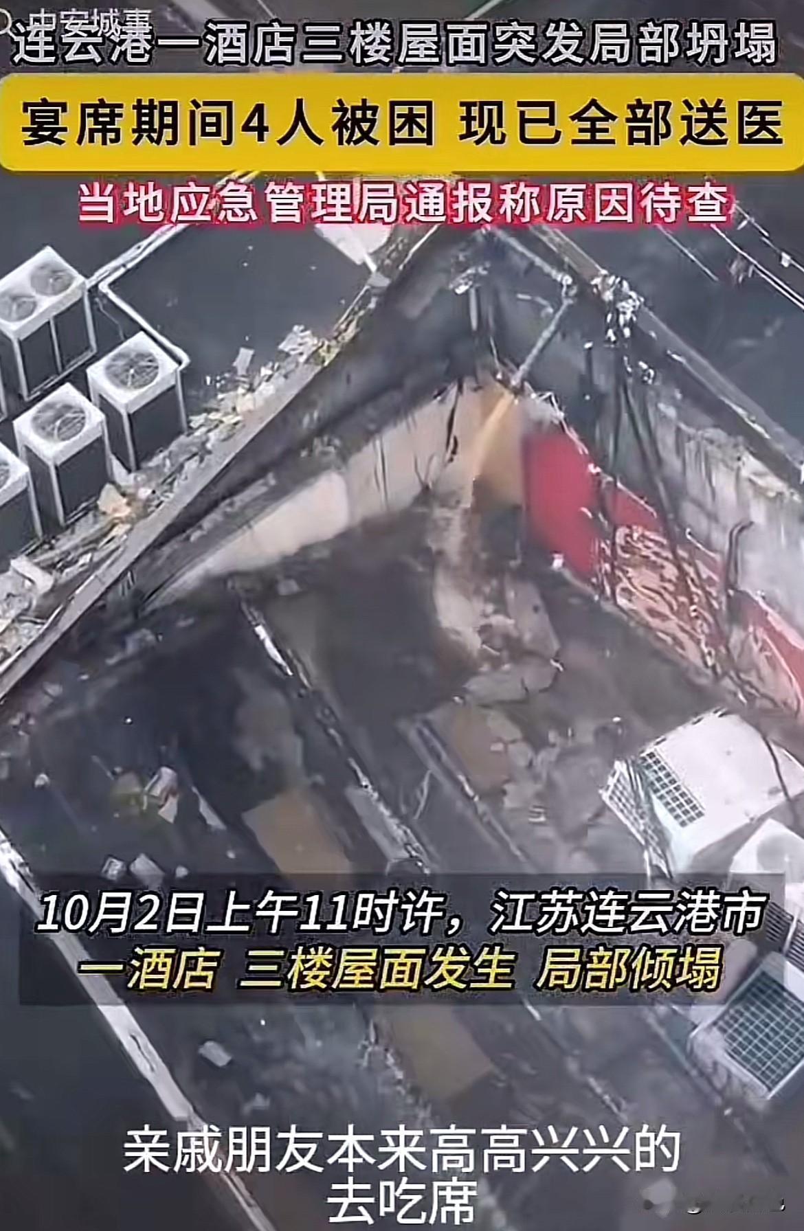 国庆办喜宴却遇塌房!这隐患早该被重视了! 谁能想到,国庆假期的喜酒竟喝成了惊魂一刻?10月2日上午,江苏连云港东海县名家厨房酒店里,四户人家正热热闹闹办喜宴,三楼屋面突然“轰隆”一声塌了!水泥块混着吊顶往下砸,伴娘被砸得满身是血,新人刚下楼就目睹这惨状,情绪直接崩溃。 事后才知道,这酒店为了搞“无柱大厅”吸引办宴的人,疑似拆了承重墙!这种为了生意不顾安全的操作,和之前苏州酒店坍塌的悲剧简直如出一辙。现在4名伤者虽暂无生命危险,但想想都后怕——要是当时大厅人满为患,后果不堪设想! 建筑安全从来不是小事,可总有商家抱着侥幸心理钻空子。希望这次能彻查到底,也给所有餐饮商家敲个警钟:别为了赚快钱拿人命当赌注!