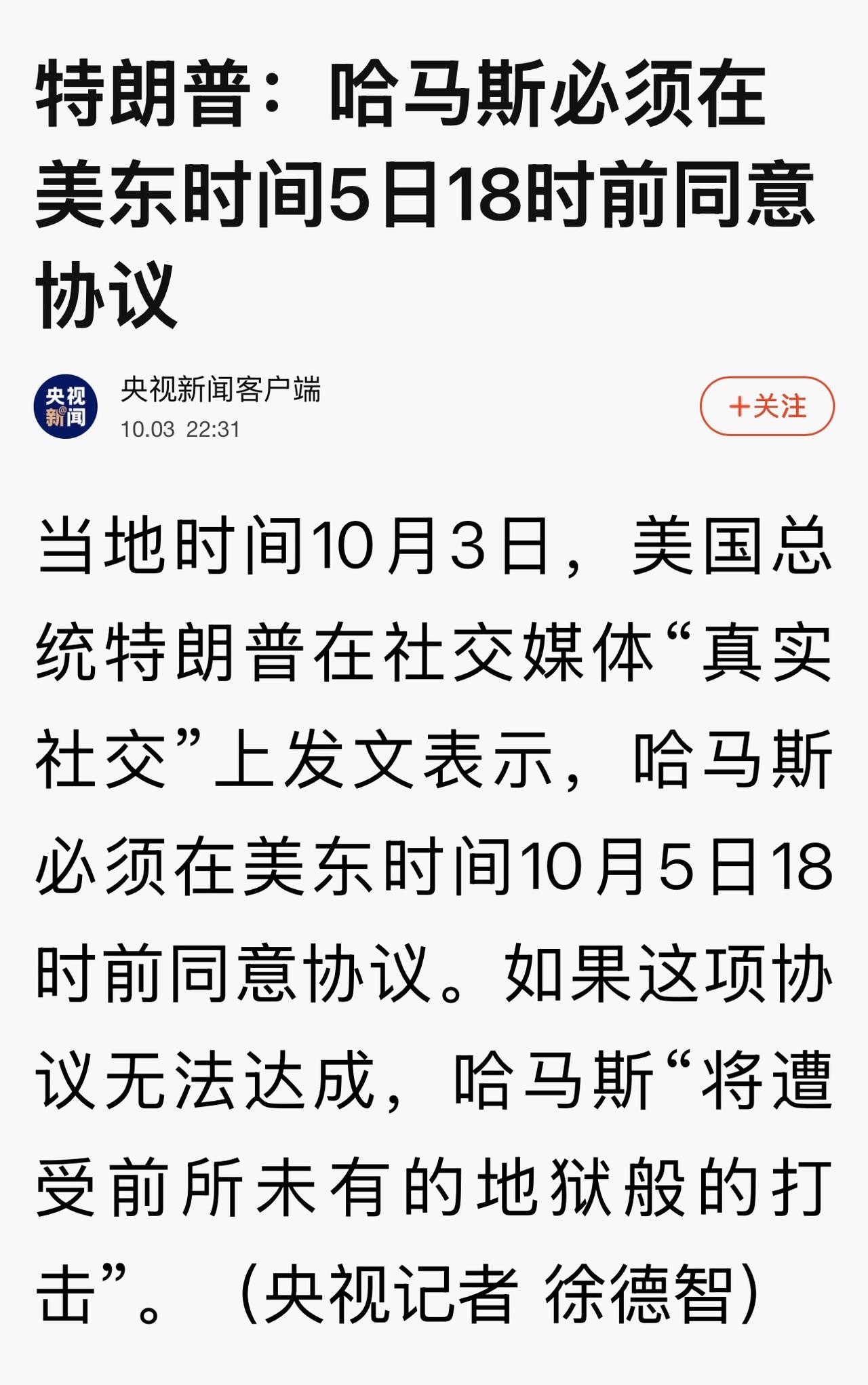 哈马斯目前承诺会“负责任地”对协议进行审查,但尚未给出正式答复。 协议即“20点计划”由美国提出,旨在结束加沙冲突。其要点包括:立即停火、以人质交换囚犯、以色列分阶段从加沙撤军,以及建立过渡性的国际管理机构对加沙进行治理。计划的目标是将加沙地带非军事化,并排除哈马斯的参与。