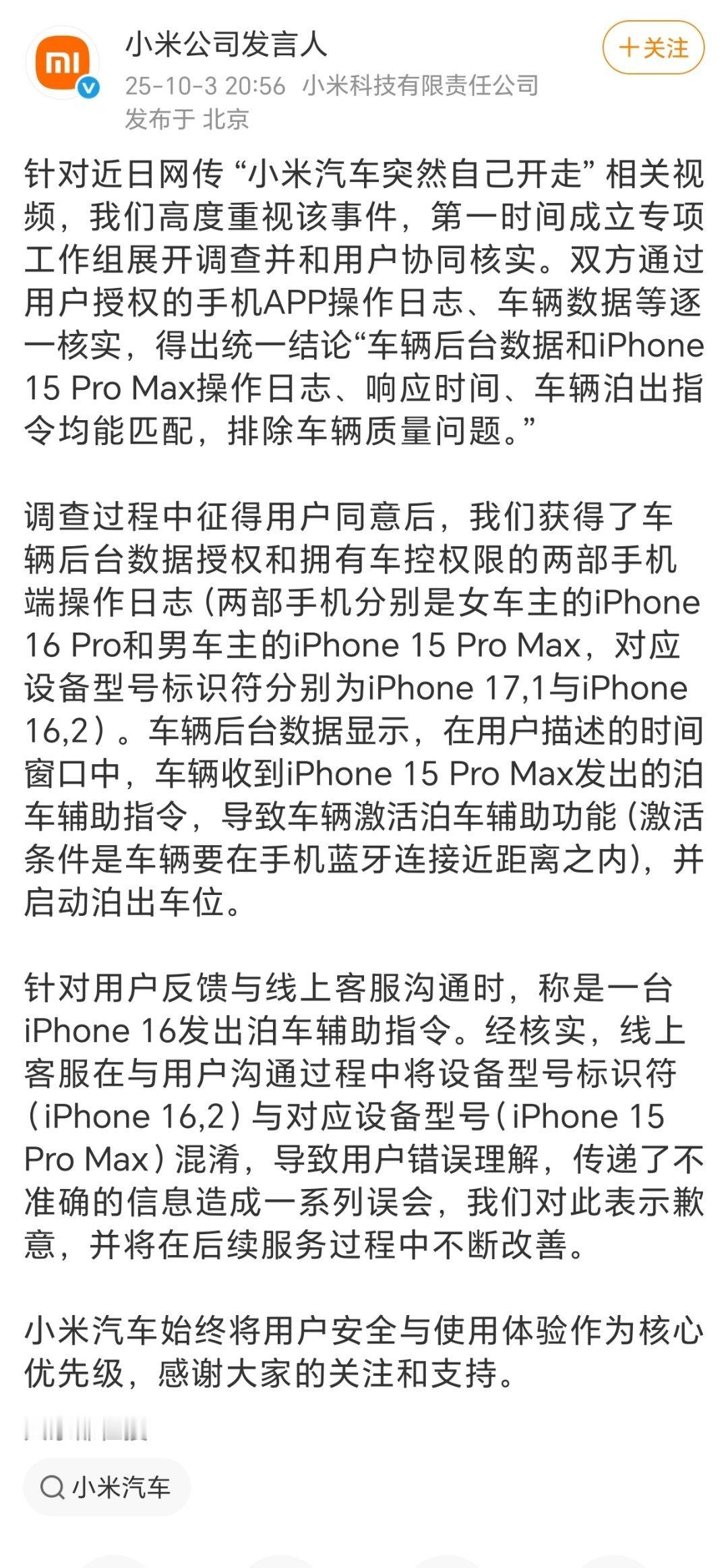 官方回应小米汽车突然自己开走了小米公司发布通报,回应网络热议事件“小米汽车突然自己开走了”