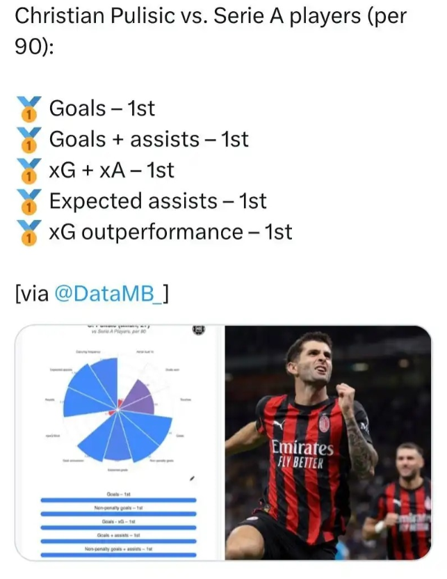 DMB:普利西奇vs.意甲球员(每90分钟) 进球数:第1 预期进球:第1 进球+助攻:第1 预期进球+预期助攻:第1