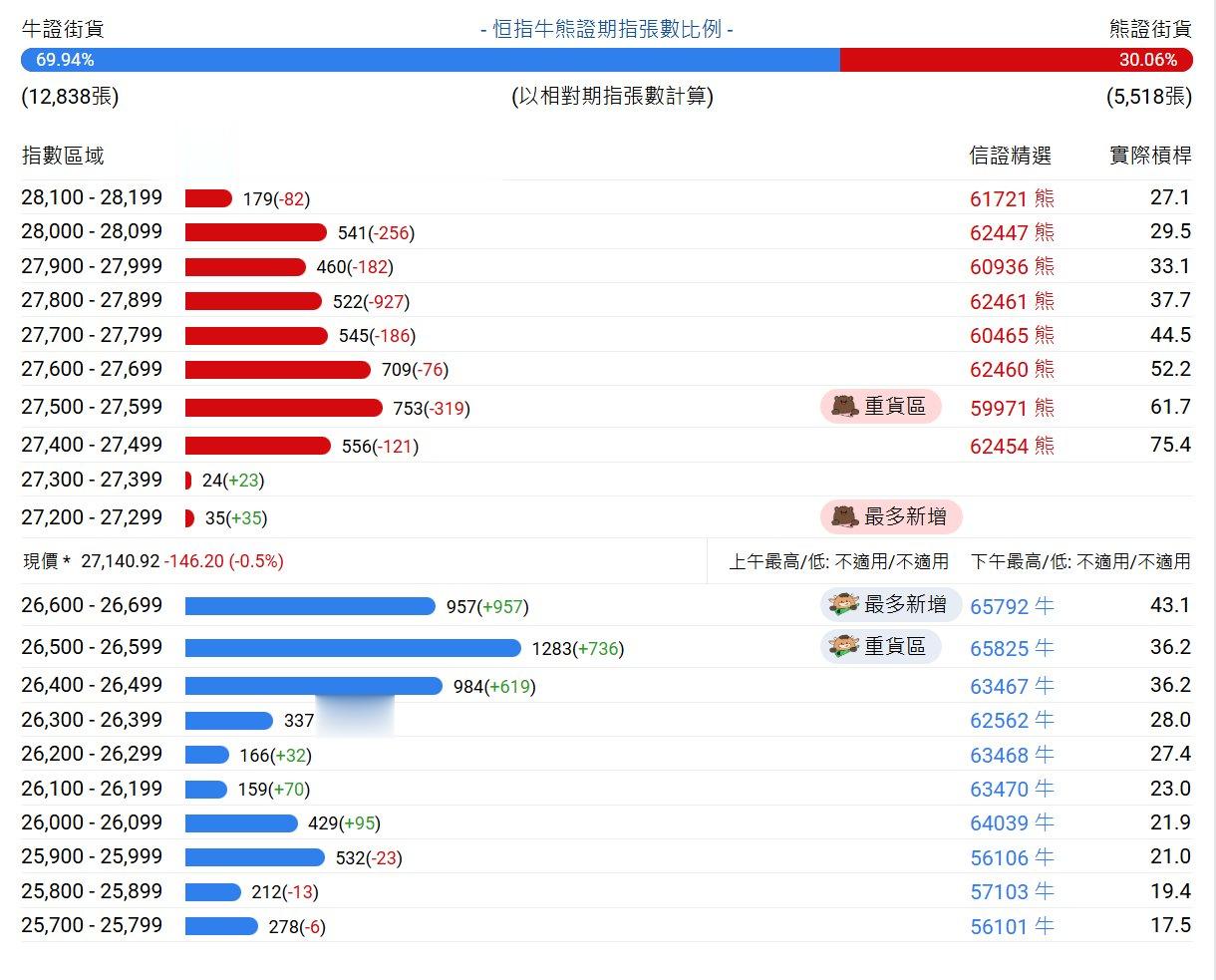 中信证券牛熊证街货分布图中的数据显示,熊证街货重货区在27500-27599区间,该区间最新熊证数量为753张,较上一交易日减少319张,熊证街货最多新增在27200-27299,该区间最新熊证数量为35张,较上一交易日增加35张。