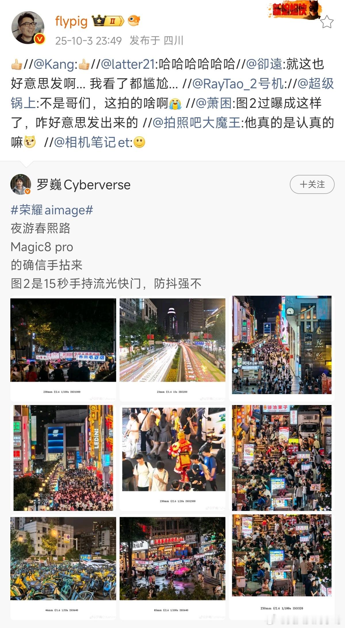 昨天荣耀手机影像部门的负责人又发了几张magic8系列新机的夜景样张,然后来了一大批数码博主的一致“[good][good][good]”,你们怎么看待?[笑而不语][笑而不语][并不简单]