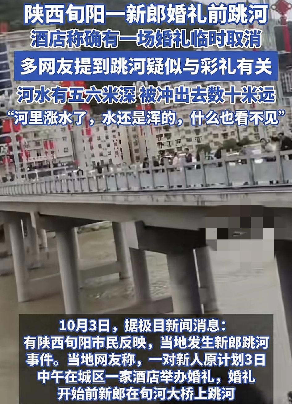 陕西新郎跳河了,2万"下车费"逼死新人?酒店喜糖还在,母亲当场晕厥太悲剧化了