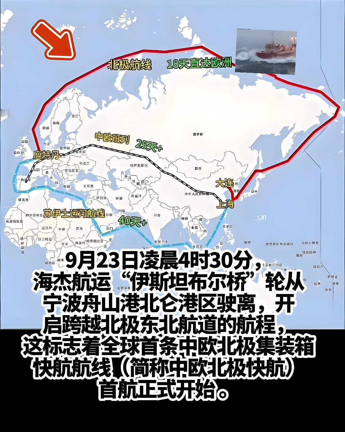 我是个地理爱好者,看到现在开通了北极航线,我们运输货物到欧洲,有了新的备选方案,