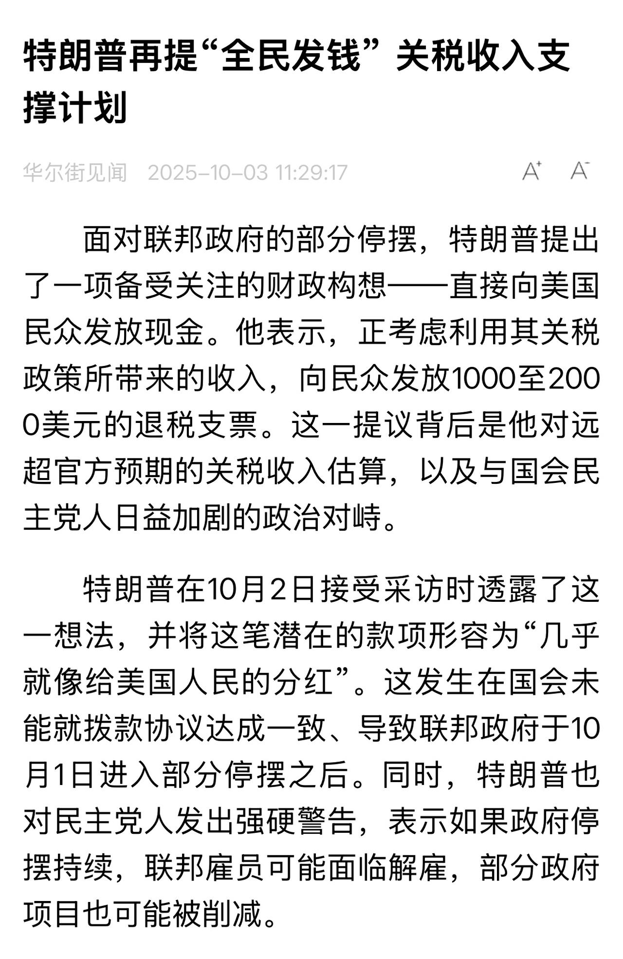 美国今年预计3000亿美元的关税收入,远不足以支持全国3.47亿人口每人发放1000-2000美元。 但若将发放单位转为家庭,则具备可行性。 而面向全民的发放计划,需待明年关税收入达到1万亿美元的目标后方可能实现。