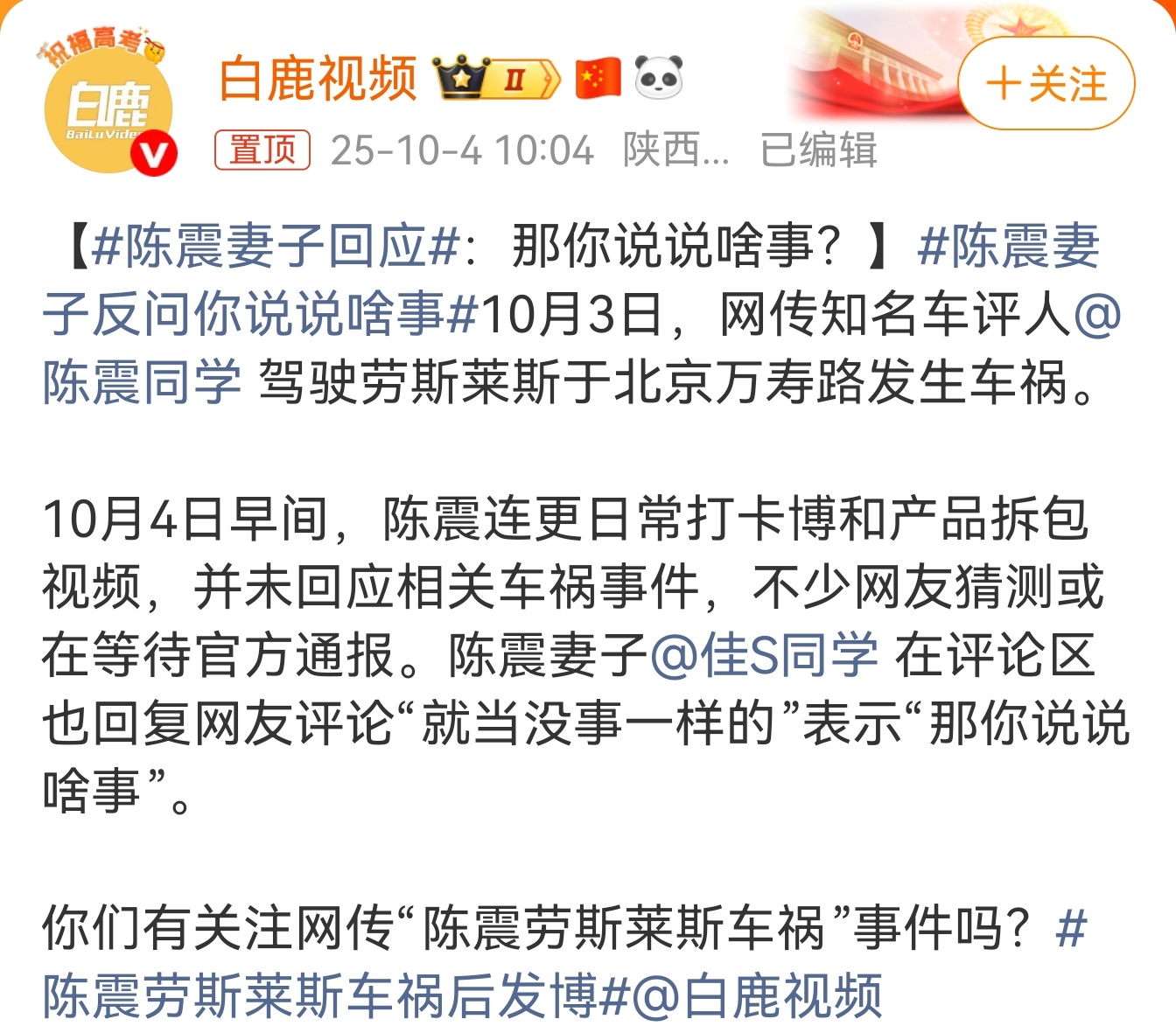 陈震妻子回应陈震的妻子已确认,他本人确实没事。