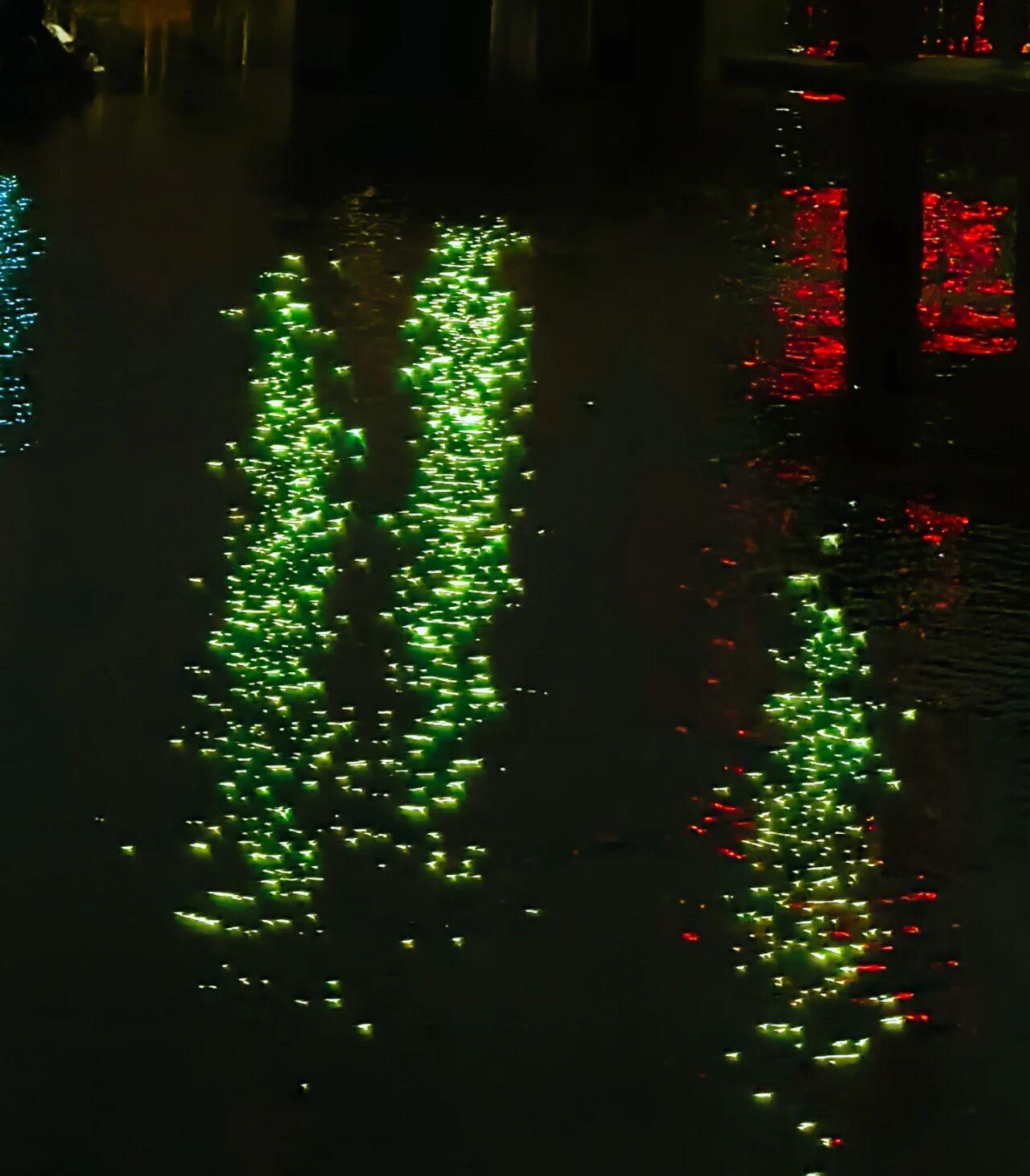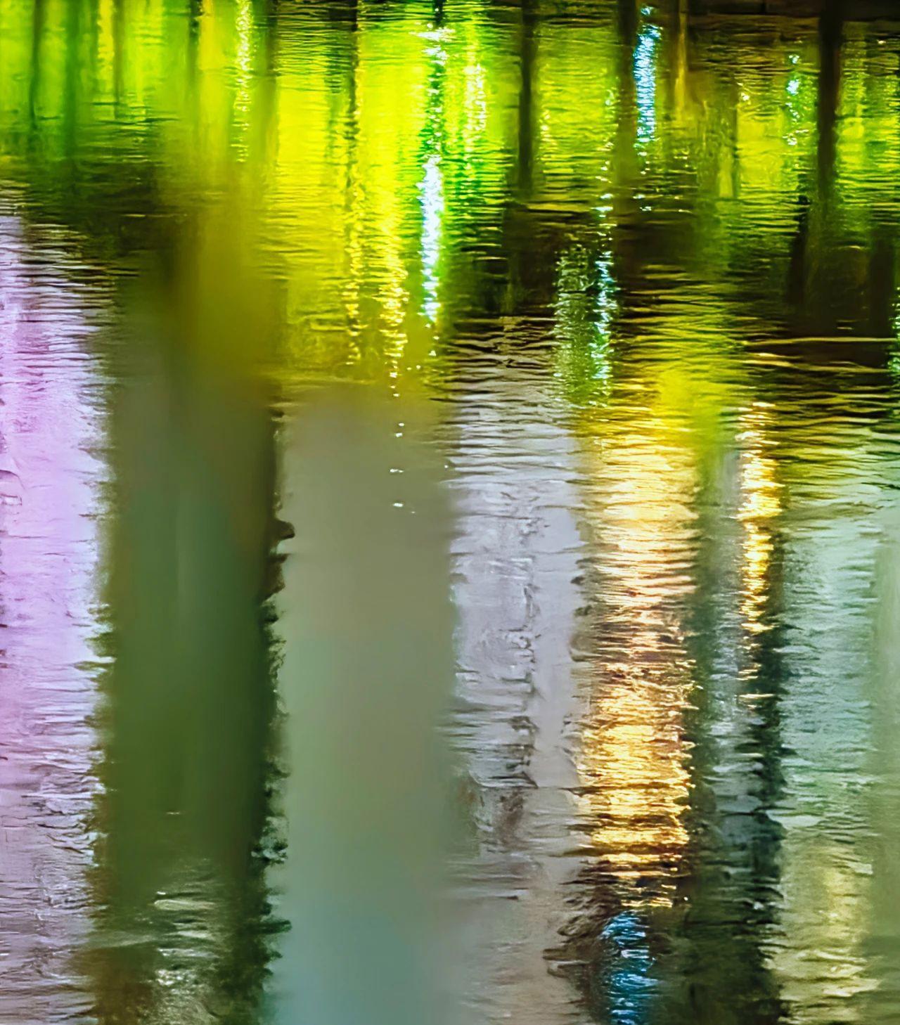 夜色泼墨 夜把光揉碎 掷入水面洇开 红的焰 绿的纱 在波纹褶皱里 晕染成画 灯