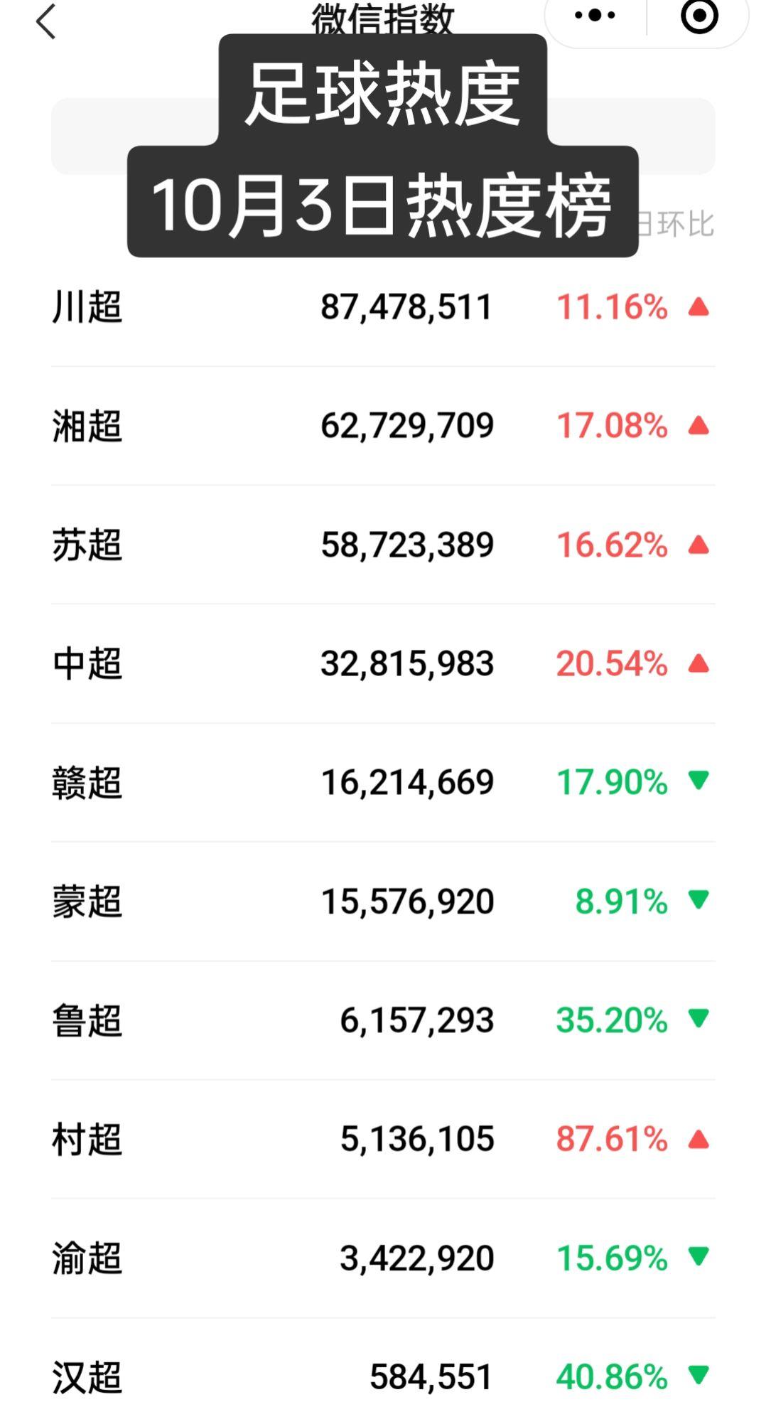 不得了了,在国庆假期期间,川超的热度居然同时超过了苏超、赣超和湘超,来到了榜一的