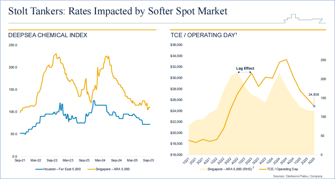 “由于地缘政治的持续波动,StoltTankers的收益进一步减弱,日均TCE下降了26%,降至24838美元,而去年同期则创下历史新高。”