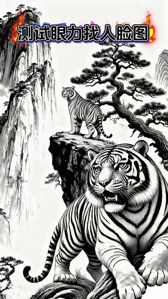 测试眼力找人脸图。 我问了五百个人,没一个能从老虎图里找出藏的人脸。你要是能找着,说明你脑子还特年轻,灵的很。二零二五年指定顺风顺水,啥事都顺心。我自己瞅半天,光看见老虎和山崖了,人脸压根找不着。你要是瞅着了,可得知一声让我瞧瞧,你这厉害的眼力劲儿,也沾沾你二零二五年的好运气。