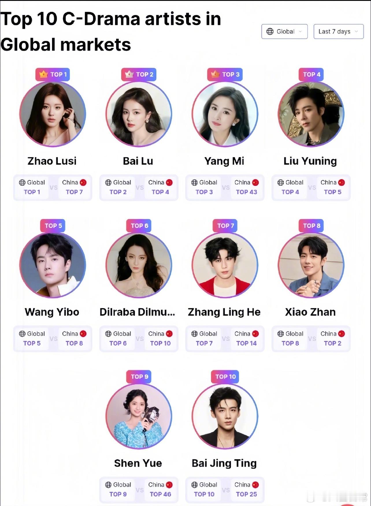 内娱艺人国外热度榜top10赵露思、白鹿、杨幂、刘宇宁、王一博、迪丽热巴、张凌赫