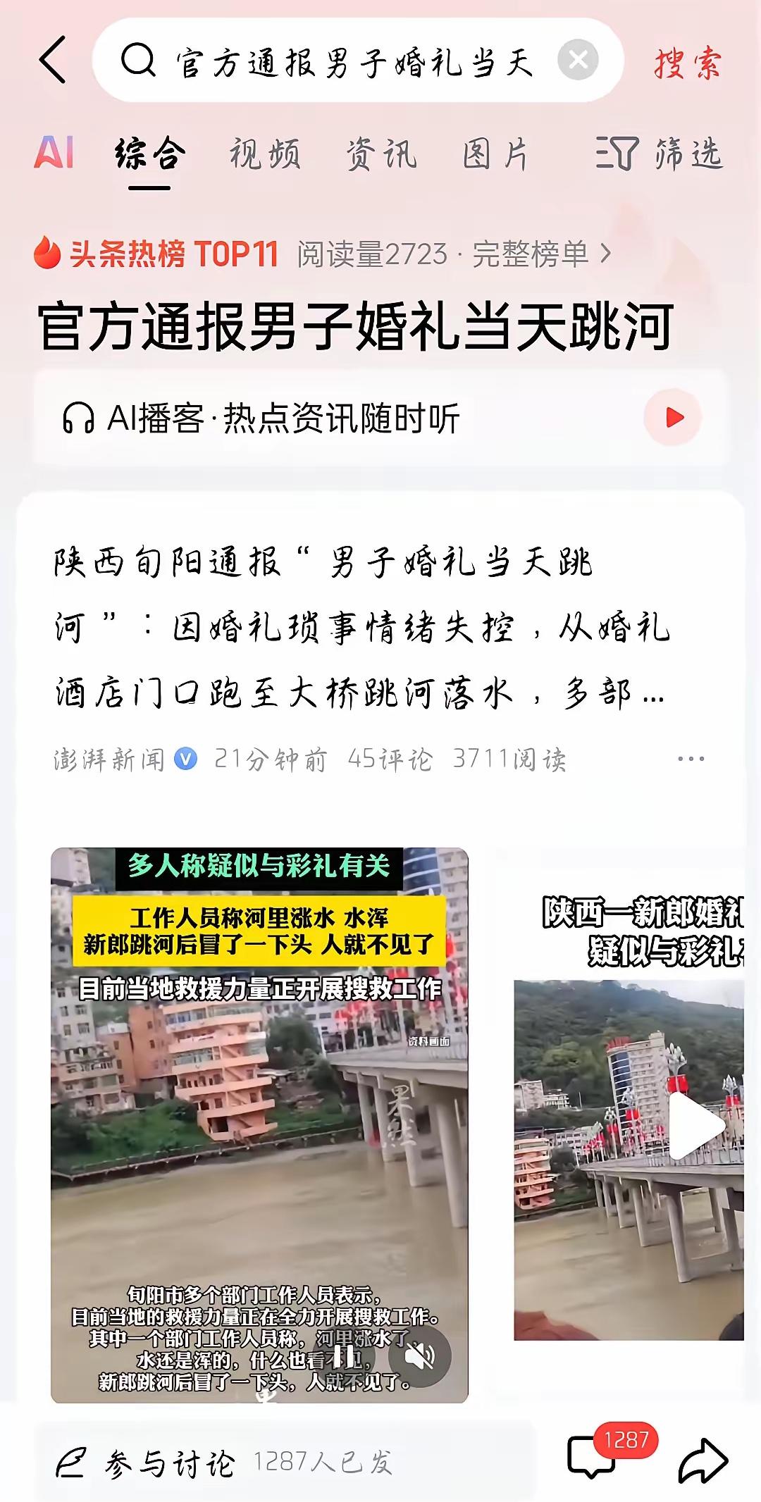 据澎湃新闻报道,官方通报男子婚礼当天跳河,因婚礼琐事情绪失控,从婚礼酒店门口跑至