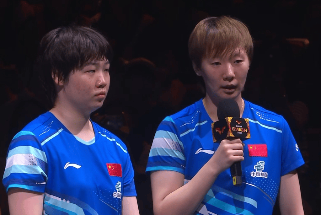 王曼昱:虽然拿到了冠军,但是和蒯曼有很多值得总结的地方。包括今天的决赛,虽然蒯曼状态不是很好,但双打毕竟是一对组合,可能就是需要有人出来承担,需要有人扛得住。今天能够赢下来,还是觉得非常好的。也谢谢现场的观众为我们加油。