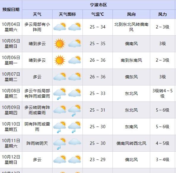 人家都下雪了,宁波人的空调继续开起来,防暑降温! 宁波常年入秋时间是10月4日,也就是说今天本该是迎来秋凉的时候,但今年此时高温依旧肆虐,预计又将有纪录打破(市区往年10月没有出现高温)。明天到7日基本都是多云的天气,中秋节(6日)夜间天况预计还是比较适宜赏月的。不过届时气温又上一个台阶,最高可达36℃以上,高温要到8日才会有所缓解。 近期重点仍然是防暑降温,大家外出要提前做好规划,在户外做好防晒措施并及时补水。