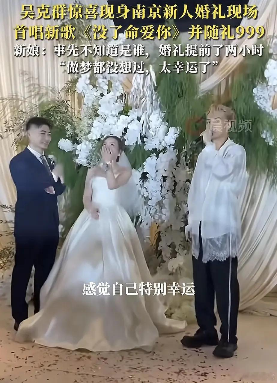 不过,婚礼过半,吴克群突然空降婚礼现场,带着一曲新歌《没了命爱你》,为这对新人送上最诚挚祝福,还随了一份999元的礼。事后,新娘感慨“做梦都没有想过,太幸运了。