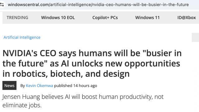 [环球网科技综合报道]10月4日消息,据外媒windowscentral报道,针对生成式人工智能(AI)可能引发大规模失业的担忧,NVIDIA首席执行官黄仁勋本周再度发声,强调AI“不会取代人类,而是让人类更忙碌”。他预计,机器人、生物技术与设计等前沿行业将在AI推动下诞生大量新岗位,人类创造力与判断力反而比以往任何时候都更不可或缺。