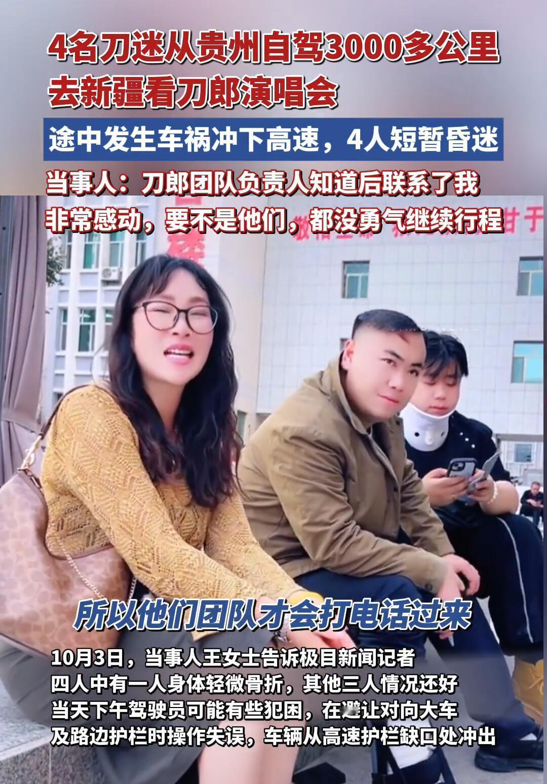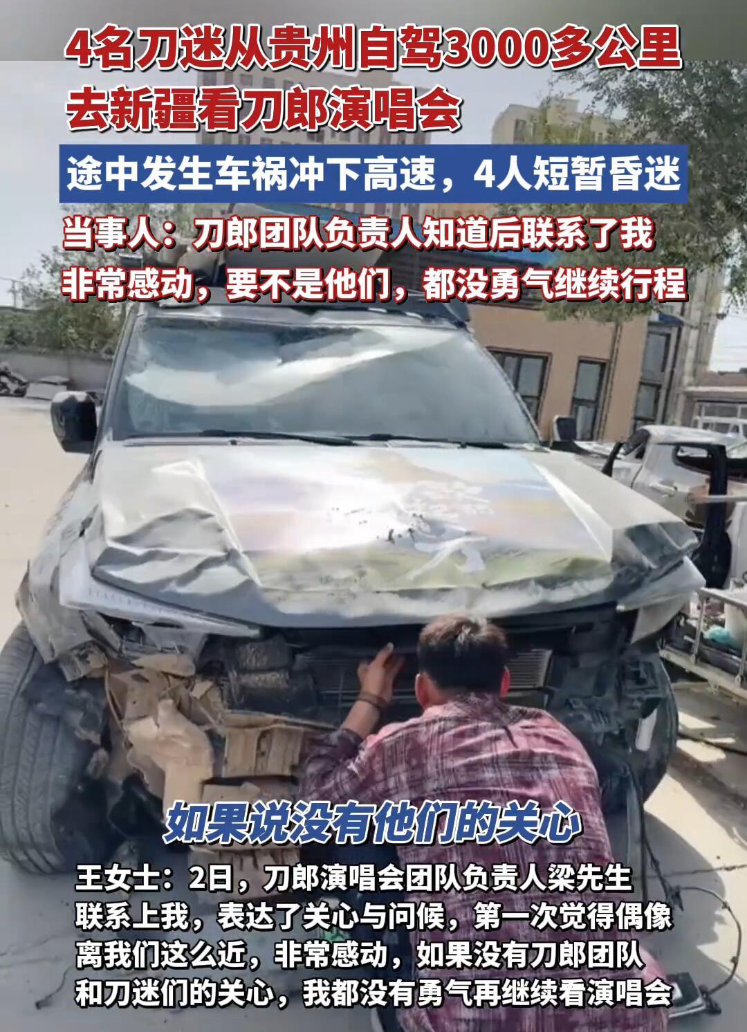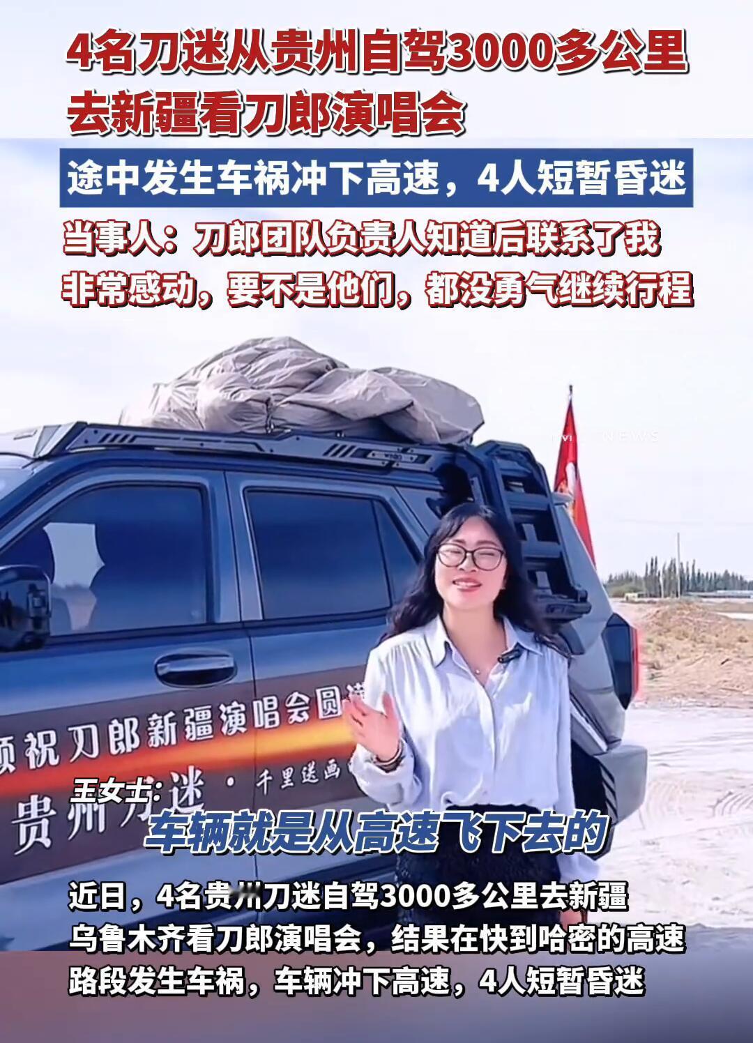 谁能想到,追个星还能在戈壁滩上差点把命搭进去?这事儿就发生在四个贵州刀迷身上。他们四个都是70后,喜欢刀郎二十多年了,9月25号从毕节开着一辆贴满祝福横幅的越野车,直奔乌鲁木齐——就为了看刀郎巡演的收官场。 结果9月30号下午,在离哈密还有一二百公里的地方,司机犯困,为了躲大车,方向一偏,车子直接冲出高速护栏,翻了好几圈栽进戈壁滩的坑里。四个人全昏过去了,醒来都不知道晕了多久。幸好救援来得快,最后就一人轻微骨折,其他都是皮外伤。 这事儿被其中一个叫王姐的刀迷发上网,没想到,刀郎团队的人居然主动找来了。10月2号,团队负责人梁老师亲自联系她,反复叮嘱注意安全,特别暖心。王姐说,要不是这份关心,她真没勇气继续走下去。 现在他们四个已经换动车到了乌鲁木齐。虽然之前把票退了现在还没补上,但王姐随身带了五幅自己画的刀郎肖像。她说哪怕进不去,也要托团队把画交给刀郎。 其实刀郎团队一直这么有人情味。之前在杭州,他为一个白血病歌迷加弹《谢谢你》;合肥场还给高位截瘫的粉丝开绿色通道。说白了,为什么从00后到94岁老人都能在他的演唱会大合唱?就是因为这份双向的真心。 今晚乌鲁木齐奥体中心就要开唱了,希望这四位一路坎坷的刀迷能亲耳听到《喀什噶尔胡杨》。你也说不上来到底是谁更珍惜谁——你为他翻山越岭,他把你放在心上。这大概就是偶像和粉丝最对的关系了吧。