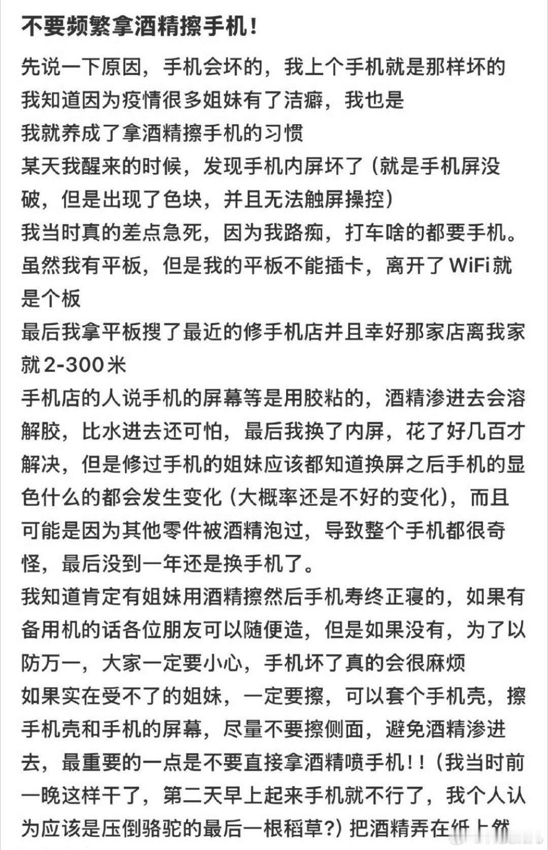 不建议你频繁用酒精擦手机的原因不建议频繁用酒精擦手机,因为酒精容易渗入屏幕,导致故障。想清洁的话,用纸巾或者干一点的酒精棉片轻轻擦拭即可[笑cry]