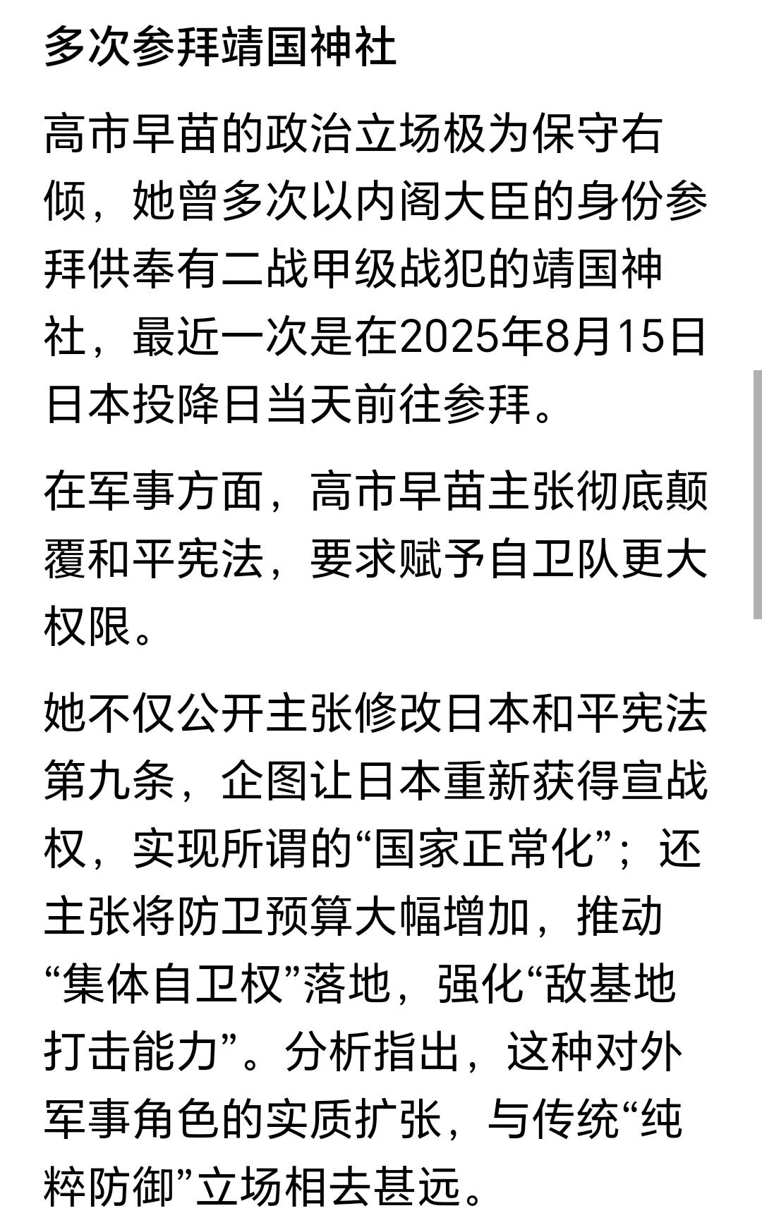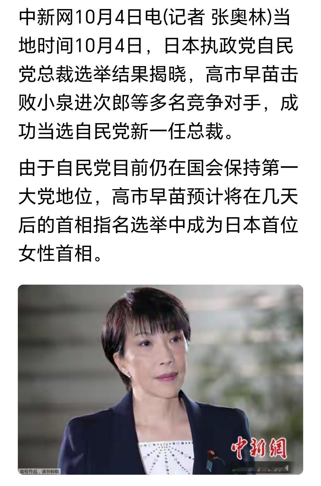 [烟花]高市早苗当选自民党总裁,将成为日本新一任首相,成为日本第一位女首相。[烟花]这女人参拜靖国神厕,试图修改和平宪法第九条然后拥有宣战权,在台湾问题上表示台湾有事就是日本有事。日本极右翼的中坚死硬分子。 就是这样一个人,在简中互联网上居然获得一边倒的支持,而且纷纷表示,希望她能说到做到,不要食言。 中国网友这小算盘打的真是天宫空间站北斗导航卫星上都听到了,在远洋拉练的福建舰南昌舰也都听到了,远在新疆内蒙的东风5C东风61也都听到了,歼20歼35也都听到了。 看来,日本的衰运还没有走完啊。请继续。 顺便说一句,听说高市早苗有个外号叫女版安倍晋三啊,哦,那没事了。 点右上角关注我,我们一起去看这个魔幻的世界