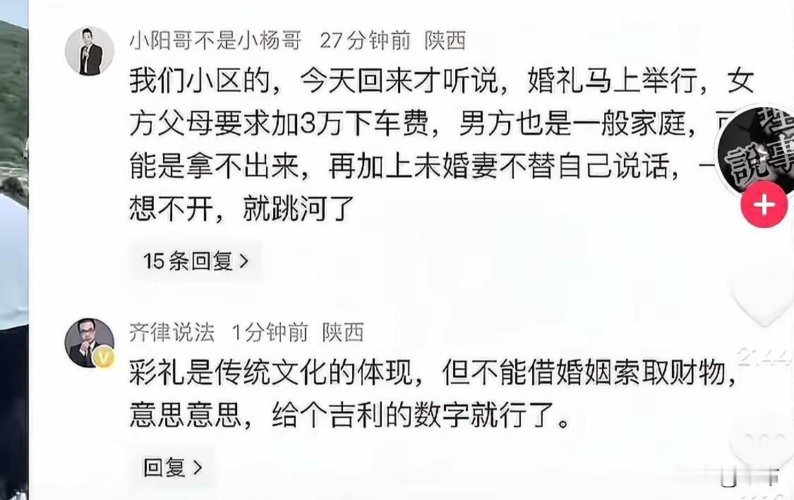 这新闻太让人吃惊了,这典型是拿别人的错误惩罚自己型人格。 陕西旬阳一个新郎,在接亲的途中,新娘家临时加三万下车费。 新郎家也是一般家庭,结个婚已经倾其所有东拼西凑了,新娘这临时起意的三万块,对他来说成了压垮他的最后一根稻草了。 通过这件事,对新娘家的办事风格应该有所了解,这一定是个矫情事多的人家,在准备婚礼的过程中,新郎一定也没少被新娘磋磨,精神和经济的双重压力,让他在听到新娘又一次提出无理要求后情绪彻底崩溃了,他当时一定觉得,人间的疾苦看不到尽头,不如一了百了。 我家也是女儿,我认为,既然都成亲家了,那就少设置一些障碍,多一些理解关心。君子爱财取之有道。再说了,都成一家人了,不是他好你才好吗?你看着他煎熬焦虑甚至气愤绝望,作为另一半的新娘,你结婚的目的是什么呢?在一场婚姻里,钱真的能凌驾于人品之上吗? 作为新郎,跳桥的行为也挺让人费解的。首先,作为男人,冲冠一怒为红颜,你当众揍她一顿然后潇洒地取消婚礼我都佩服你是个爷们。你自己寻短见这是为哪般呢?天涯何处无芳草,把彩礼要回来另娶才是你的能耐,和自己过不去干啥呢。 女方的家长,我家也是女儿,我奉劝一句,如果看中这个人了,一切适可而止,别狮子大开口,没钱自己想办法挣,女儿嫁到人家是过日子去的,别像个强盗一样动不动就抄家。 非常想认识一下新娘一家,也想问问她此时此刻啥心情。