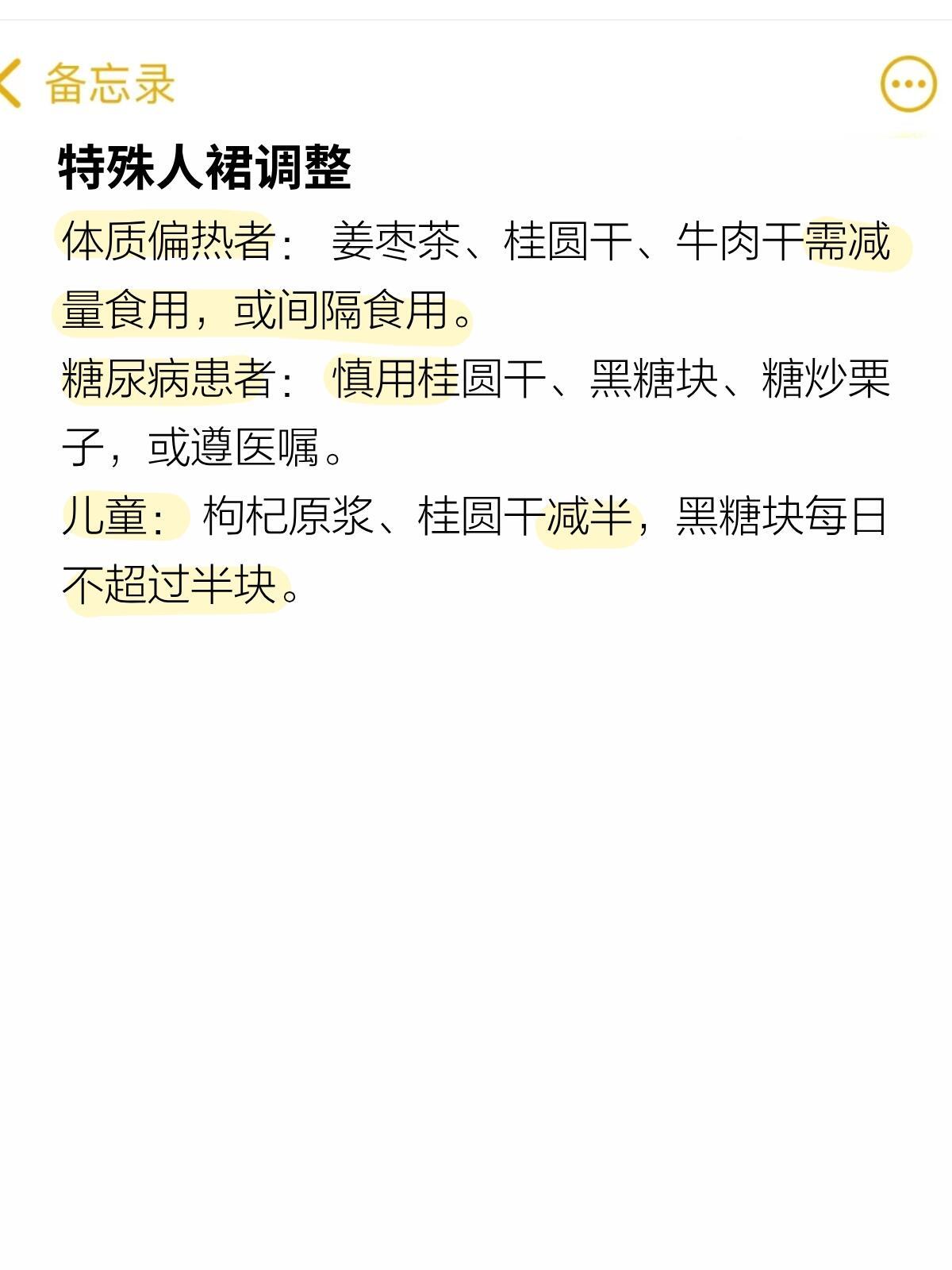 体质偏热者: 姜枣茶、桂圆干、牛肉干需减量食用,或间隔食用。