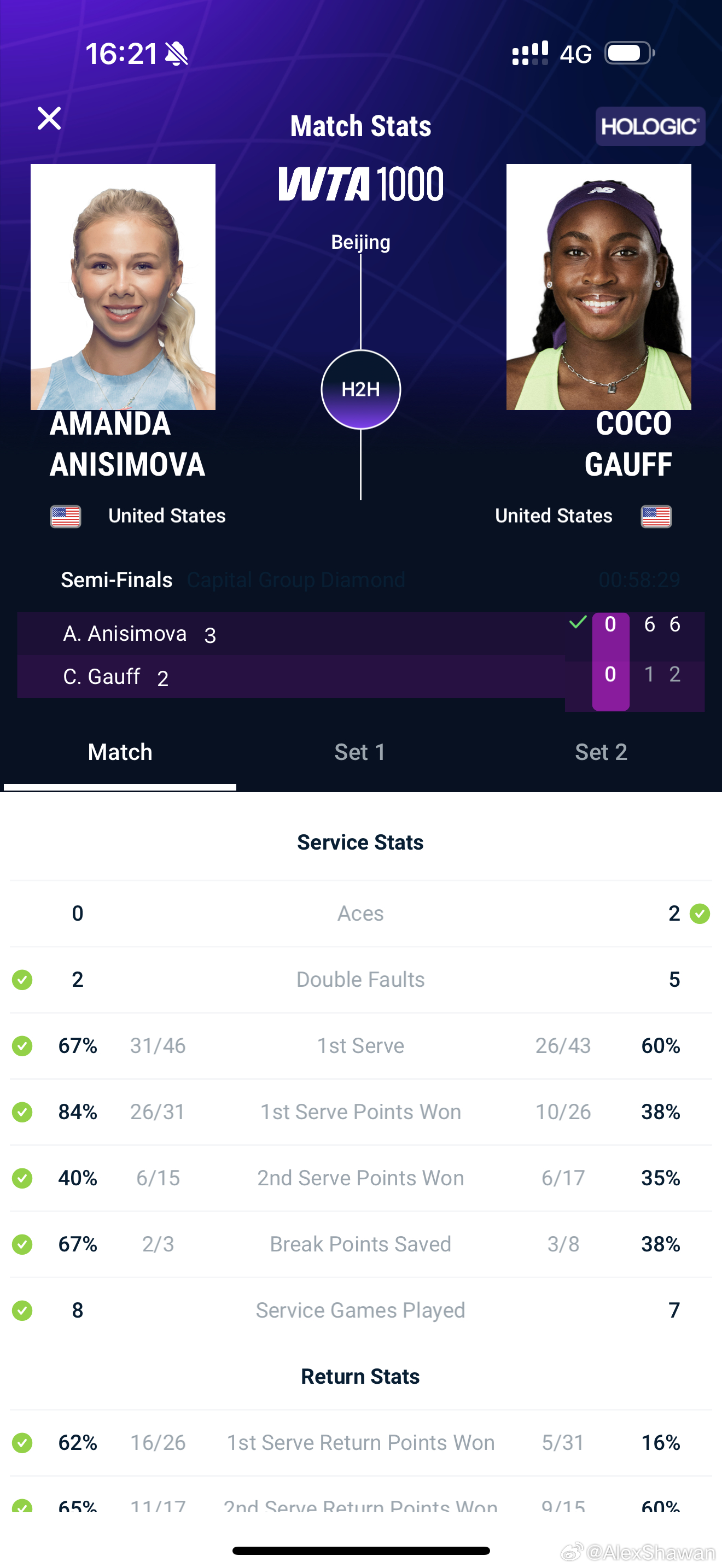 中网女单半决赛,1/4决赛经历苦战的阿尼西莫娃凭借强大的一发和84%的一发得分率以6比1、6比2横扫卫冕冠军高芙,职业生涯首次打进中网决赛,也是本赛季第5次打进决赛!网球talking大会