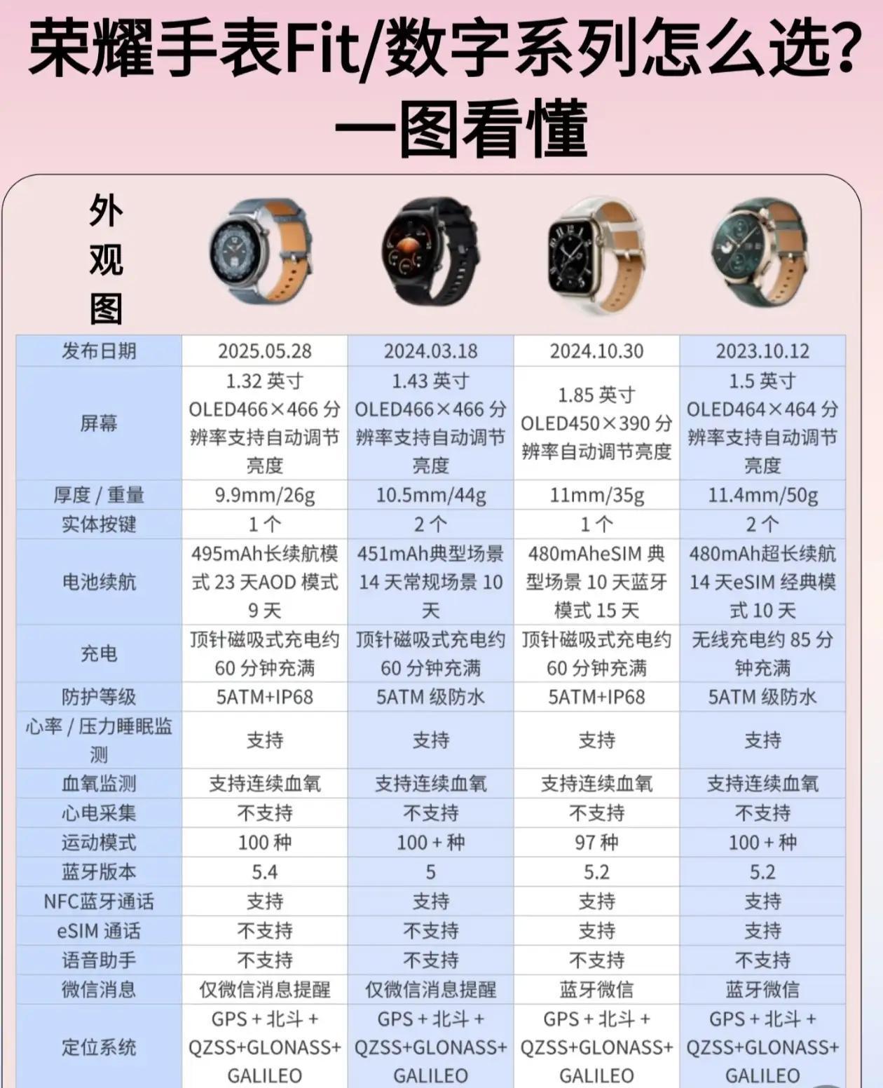 选智能设备不发愁!按需挑超容易😎 宝子们,市面上智能设备五花八门,不知道咋选?别慌,咱按发布时间和功能特点来捋捋,保准你一眼挑中适合自己的! ------ 从屏幕大小看,2024年10月30日发布的款式,1.85英寸大屏超吸睛,喜欢大视野的别错过;要是追求轻薄便携,2025年5月28日发布的这款仅9.9mm厚、26g重,拿在手里毫无负担。 电池续航上,各款都各有绝招。有的开启长续航模式能撑23天,出门再也不用频繁找充电口;有的在eSIM典型场景下能用15天,日常使用妥妥的。 充电方式也有差异,2023年10月12日发布的款式支持无线充电,随手一放就能充电,超方便。 另外,运动模式、蓝牙版本、NFC、eSIM等功能,各款也不尽相同。大家可以根据自己对屏幕大小、重量、续航、充电和功能的需求,轻松选出心仪的那一款,再也不怕挑花眼啦!