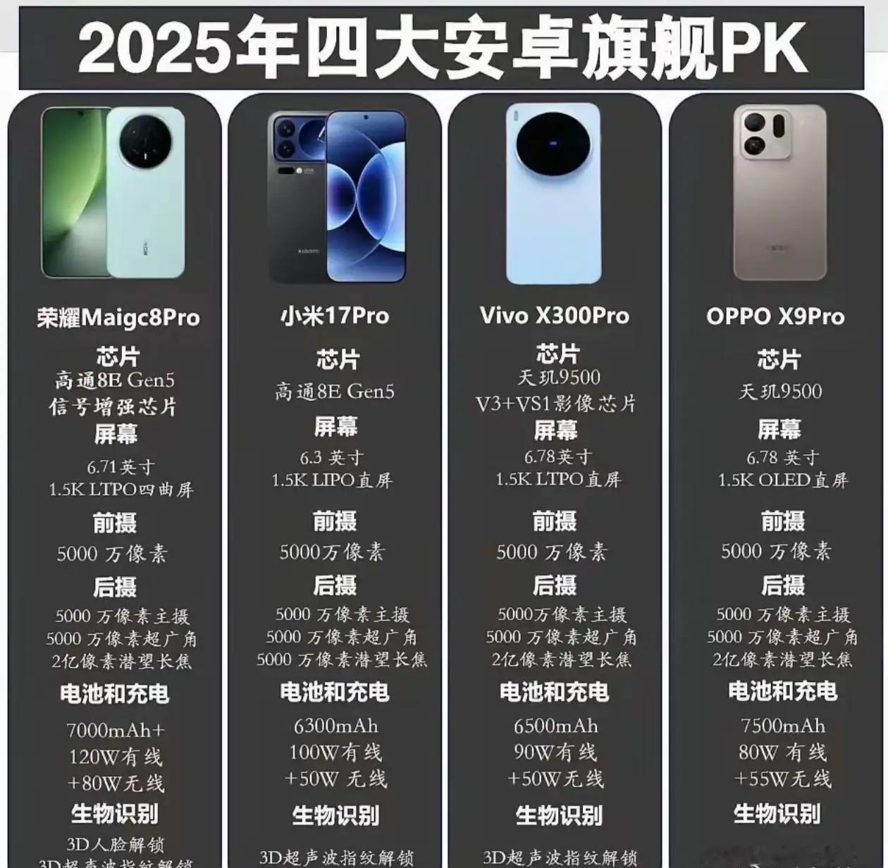 2025安卓旗舰大混战!荣耀Magic8 Pro直接“赢麻了”🤩 宝子们,2025年安卓旗舰机圈那叫一个“卷”得飞起,四大安卓旗舰正面刚,可荣耀Magic8 Pro一出手,直接“断层领先”,堪称“全能王炸”,把其他对手远远甩在身后! ------ 💪性能通讯双绝:它搭载高通8G Gen5芯片,还额外配备信号增强芯片,性能强劲得像开了挂,通讯信号也稳稳当当,不管是玩游戏还是上网冲浪,都能畅快无阻。 📱屏幕体验超棒:6.71英寸1.5K LTPO四曲屏,这设计简直绝了!视觉上清晰又细腻,手感上圆润又舒适,拿在手里就像握着一块温润的美玉。 📷影像实力爆表:影像系统更是“神级配置”,“5000万主摄+5000万超广角+2亿像素潜望长焦”,不管是拍远处的风景,还是拍近处的细节,都能轻松驾驭,随手一拍就是大片质感,摄影爱好者直接狂喜。 ⚡续航解锁双王炸:最绝的是它的续航组合,7000mAh超大电池,再加上120W有线快充和80W无线快充,回血速度快得惊人,再也不用担心手机没电的尴尬。而且还有3D人脸解锁和超声波指纹解锁双保险,解锁又快又安全。 ------ 这样一款“全能王炸”的旗舰机,谁能不爱啊?宝子们,闭眼入就完事儿了!