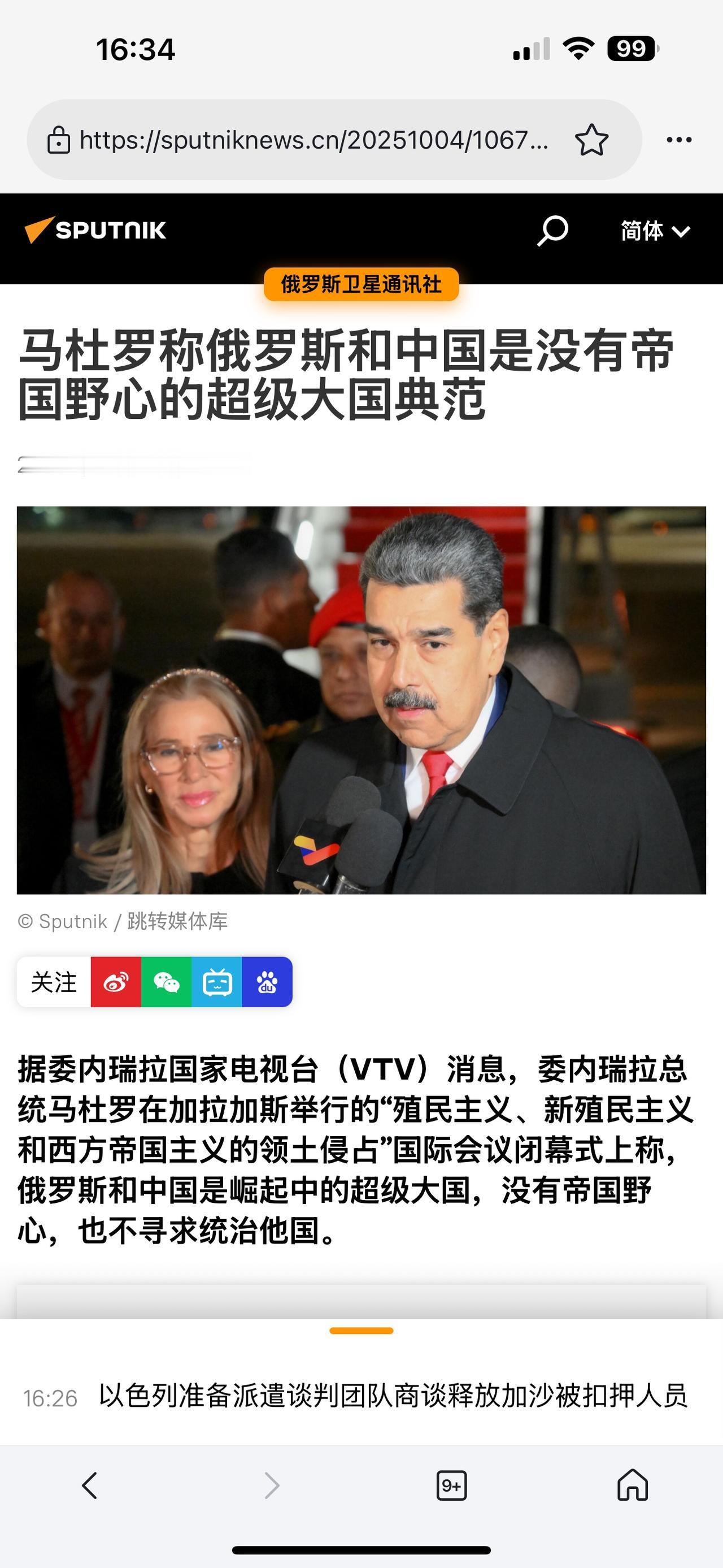 大家评一评,马杜罗的话只否是说对一半? 2025-10-4据委内瑞拉国家电视台(VTV)消息,委内瑞拉总统马杜罗在加拉加斯举行的“殖民主义、新殖民主义和西方帝国主义的领土侵占”国际会议闭幕式上称,俄罗斯和中国是崛起中的超级大国,没有帝国野心,也不寻求统治他国。