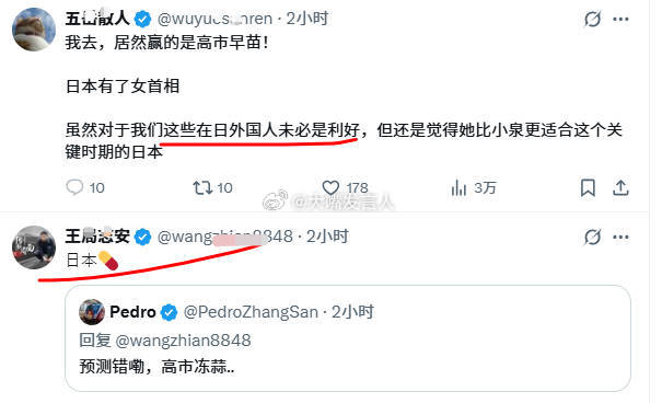 日本或将迎来首位女首相 高市早苗可能当选日本新首相,在台流浪狗很开心(图1),希望日本可以驱逐在日流浪狗王桑痔安等人,王桑发言“日本药丸”(图2),绿蛙档第一时间祝贺高市(图3)