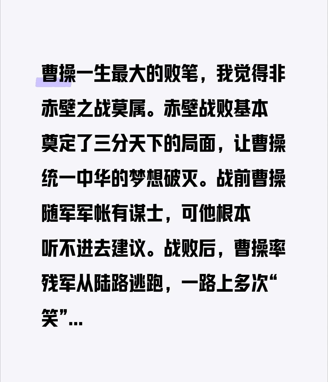 曹操一生最大的败笔,我觉得非赤壁之战莫属。赤壁战败基本奠定了三分天下的局面,让曹操统一中华的梦想破灭。 战前曹操随军军帐有谋士,可他根本听不进去建议。战败后,曹操率残军从陆路逃跑,一路上多次“笑”引伏兵。在乌林之西遇赵云,要不是徐晃张郃力战,他险些丢命;南彝陵遇张飞,许褚等力斗才让他逃脱;华容道又遇关羽,靠打感情牌才得以通过。 经此一役,曹操再难有机会一统天下,实在是一大憾事。