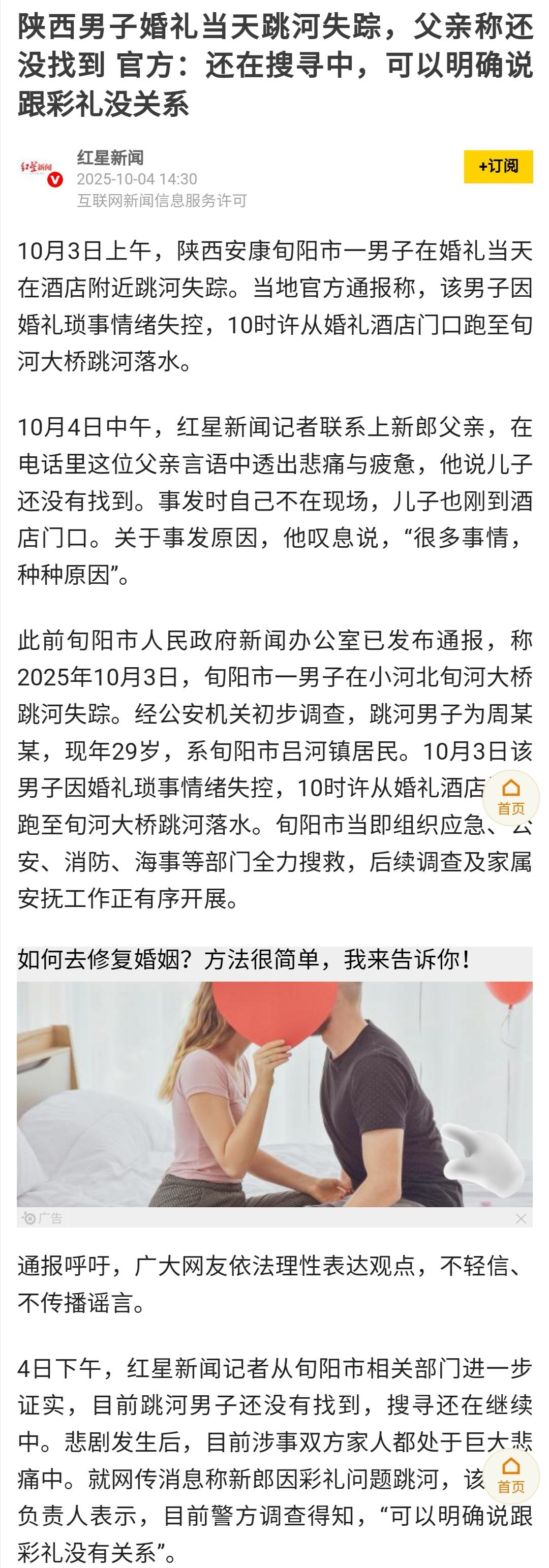 10月3日,陕西旬阳一新郎跳河自杀,知情人透露原因疑似彩礼被临时加价,新郎想不开