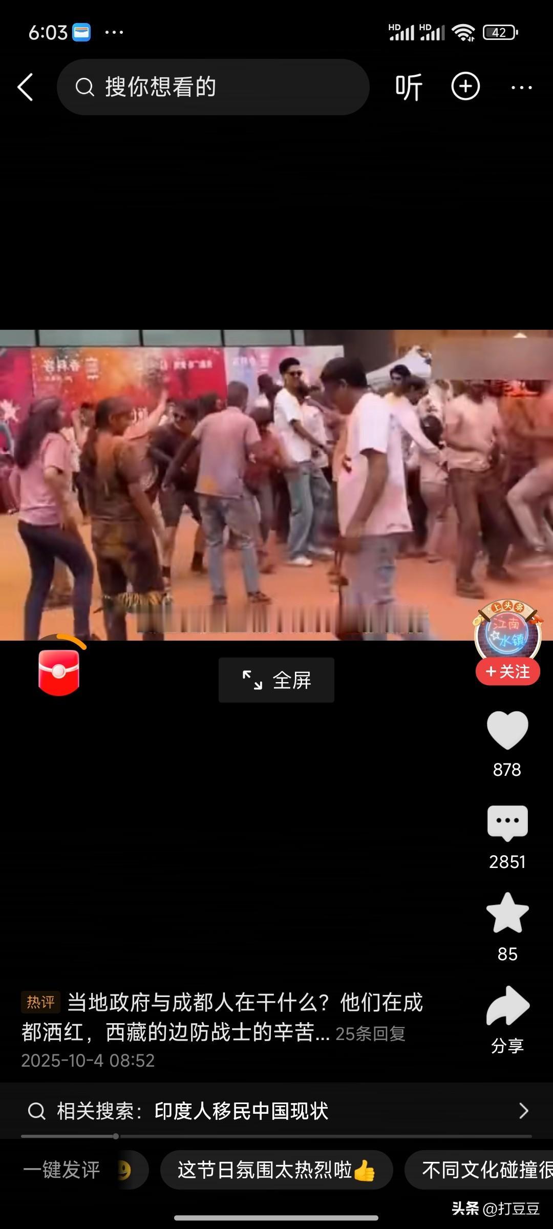印度人大规模聚集,在成都庆祝洒红节! 这个节是什么节,我个人也不太清楚,但据视频和解说,是大规模的印度人员聚集,在成都的街头巷尾,洒各色染料,跳舞! 我们尊重各国风俗习惯,但请问:染料撒的那都是,谁来清理?是印度人清理,还是印度人花钱雇人清理,再或者是我们的环卫工人清理? 按照我国法律规定,这种人员聚集,游行等是需要报批的,请问,有没有公安机关的批准? 他们的这种集会,影不影响周边居民的正常生活或者出行? 来,我们欢迎,但过节,还是请回你们的国家过去,较好,客居者不要反客为主! 另外:加拿大前段出个事,上百万印度人走上街头,要求白人回到欧洲去,他们说加拿大是印度人的!