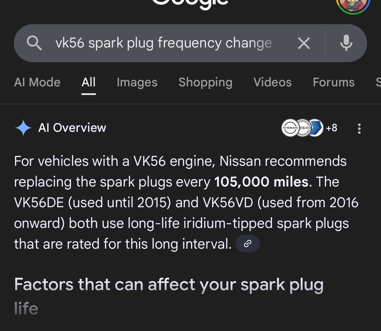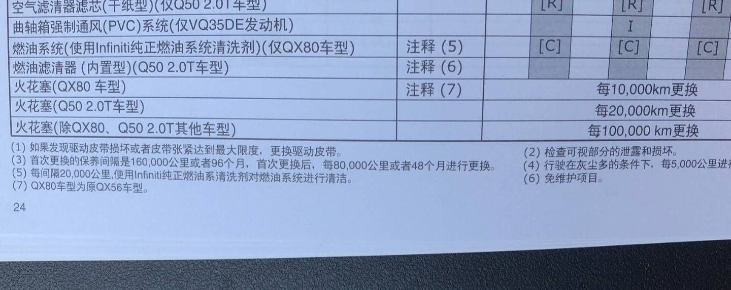 关键是,查了查资料,外网和英菲尼迪美国官网,同样的车,同样的发动机,说的是10.5万英里(16万公里)换火花塞