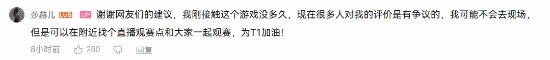 鉴于知名战队T1与iG将于10月14日进行对决,有玩家希望莎赫儿能够穿上Faker的队服前往现场,莎赫儿此前表示知道很多网友对自己的评价有争议,可能不会去现场,但是可以在附近找个直播观赛点和粉丝们一起观赛。