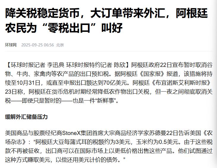 美国大豆熟了!所以米莱突然把阿根廷关税降到0,配合中国卖了130万吨大豆,然后又迅速恢复,让美国措手不及,印度也趁机买了几万吨大豆油,还真是会捡漏! 9月22日这天,阿根廷总统米莱直接把大豆出口税从26%降到了0,中国买家反应超快,当天就签下20船订单,把130万吨大豆给锁定了。 更绝的是,才过两天阿根廷就把关税恢复回去了,这一下可把美国农民整懵了,好好的生意被搅了局。 阿根廷这么干其实也是没办法,本国货币比索跌得厉害,外汇储备都快见底了。取消大豆出口税后,每吨成本一下降了123美元,中国买家立马就来了,两天就给阿根廷送来了70亿美元外汇,当天比索汇率都涨了4.5%。 而且阿根廷10月要中期选举,米莱政府急着拿政绩拉选票,农业出口又是他们的经济支柱,这招“零税突袭”虽然抢了美国的生意,但确实帮他稳住了不少局面。而中国能这么快出手,其实也早有准备。 自从今年年初美国对华加征关税后,我们就一直在找更多大豆供应来源。2025年1到8月,从巴西进口的大豆占比升到了85%,从阿根廷买的也越来越多。 这次阿根廷政策一松口,中粮、中储粮这些国企马上行动,20船大豆从11月开始分批运过来,把未来半年的供应都锁定了。还搞了区块链溯源,就是防止美国大豆换个包装冒充南美大豆卖过来。 美国农民这就惨了,刚收的大豆还没地方放,仓库里已经堆了4380万吨旧豆,是1988年以来最多的。芝加哥期货交易所的大豆价格一周跌了3%,农民每卖一吨都要亏几十美元。 更气人的是,美国政府之前还答应给阿根廷200亿美元援助,结果人家转头就用中国的订单“摆了美国一道”,爱荷华州的参议员都忍不住骂“这就是现代版的农夫与蛇”。 阿根廷降税不光中国受益,印度也趁机捡了个便宜。 印度倒没直接买大豆,而是盯上了阿根廷豆油。海南洋浦的粮油企业把阿根廷大豆加工成豆油后,9月一下子出口印度2000吨,抢占了东南亚市场。印度炼油厂还趁机压价,从阿根廷进口豆油的到岸价比美国低15%,省下来的钱都够再买两艘货轮了。 现在,特朗普政府想靠补贴稳住农民,但2025年的补贴金额还没定下来,农民根本等不起。 更关键的是,中国现在买南美大豆已经成了习惯,巴西港口扩建后,大豆从收割到运到中国港口只要20天,比美国快15天。就算美国现在取消关税,重新打通物流、赢回信任也得好几年。 美国农业协会主席都叹气说:“我们正在失去一代中国客户”。