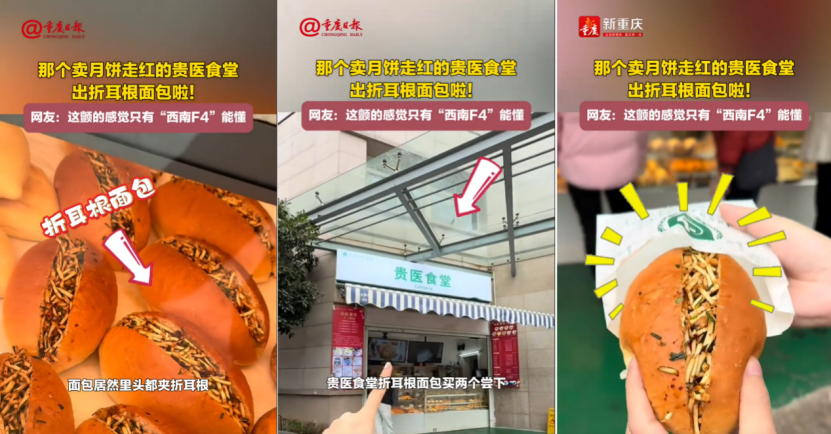今年2月,网友在贵州医科大学附属医院的“贵医食堂”,买到折耳根烤肠面包,金黄的面包中间夹满凉拌折耳根,6元一个。